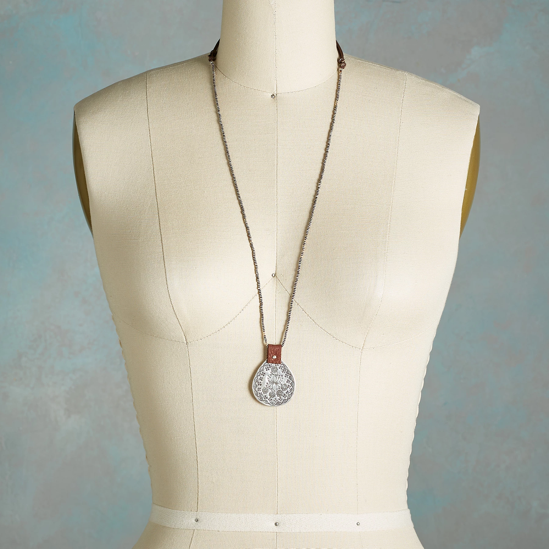 Hand-stamped Thai silver, leather, 14kt gold-filled beads and cultured freshwater pearls come together in a necklace that feels well-traveled, quietly compelling and just a touch mysterious. A lotus blooms at the pendant’s heart. Adjusts with slider knots. Handmade in USA. Exclusive. 28″ to 36″L. 2″drop.