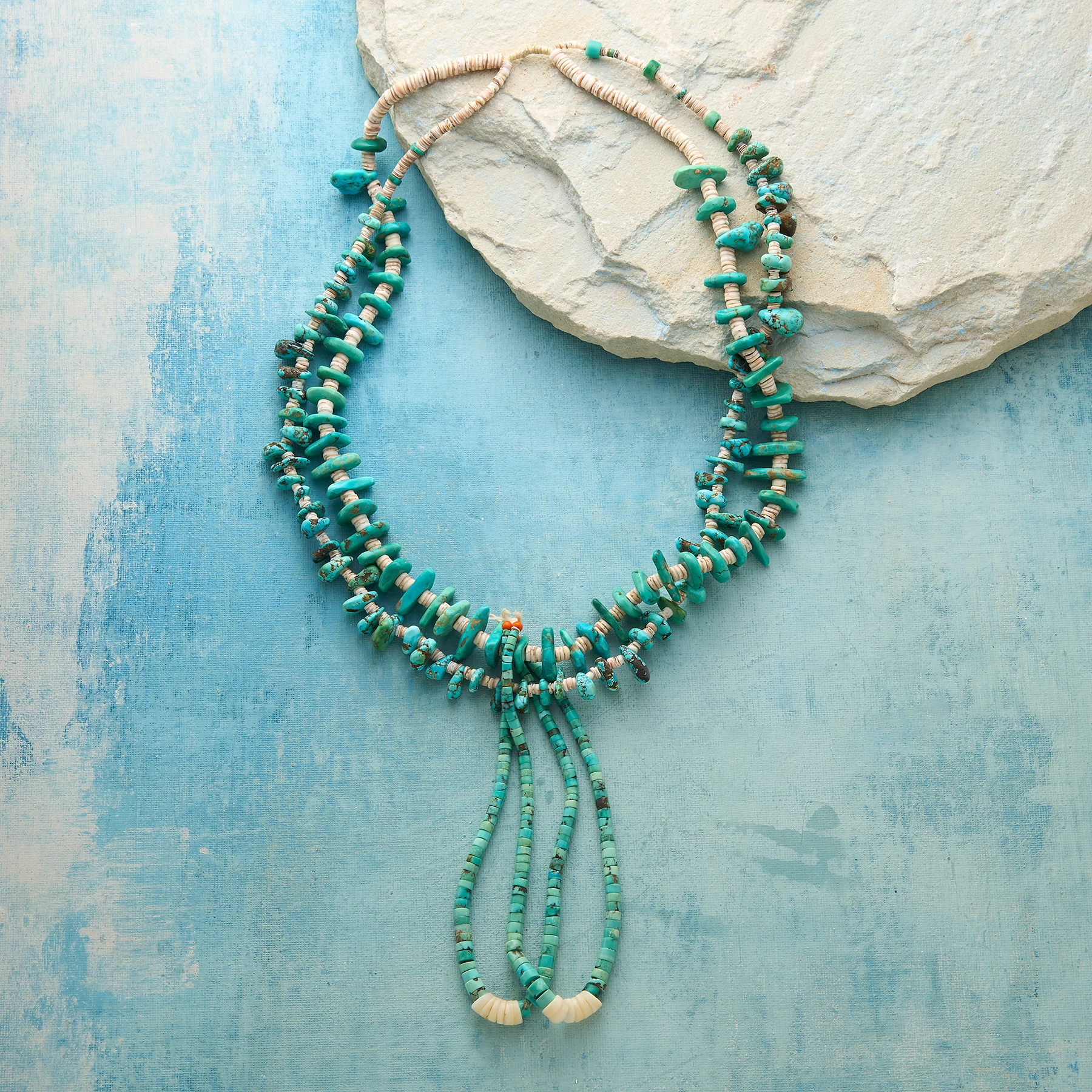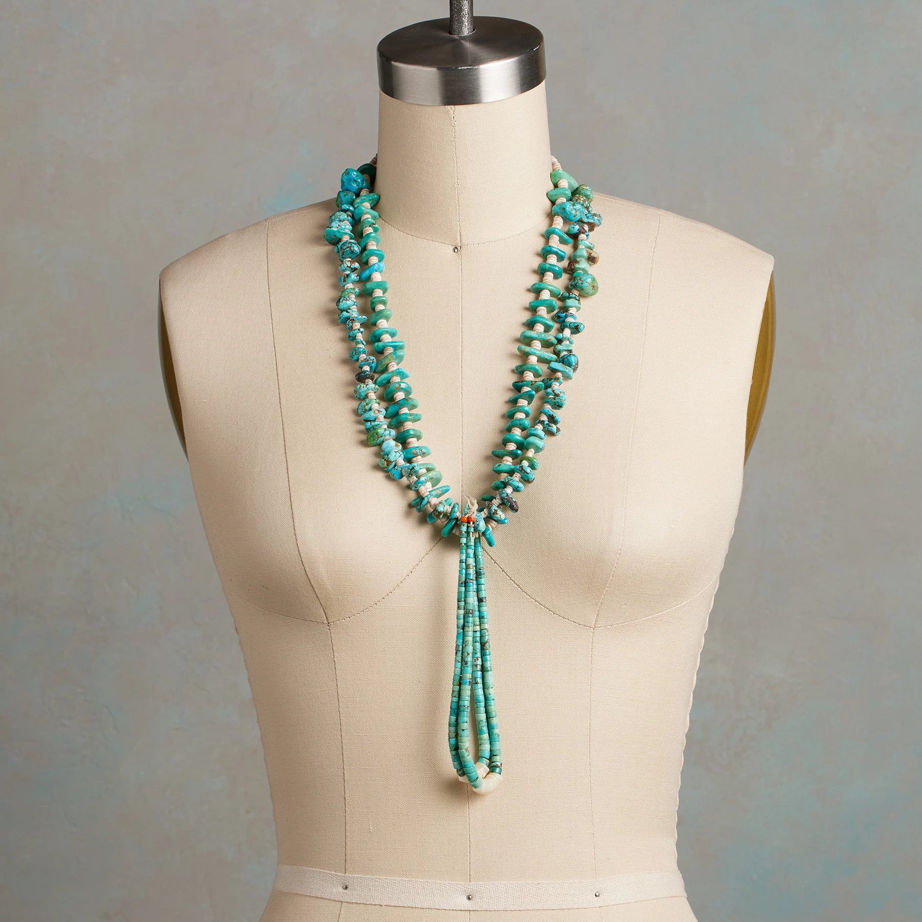 Jaclas, or loops of heishi beads, were commonly worn as earrings but also used to adorn necklaces as in this vintage necklace. Handcrafted by a Santo Domingo artisan using traditional techniques such as hand-powered pump drills, the necklace is strung with tabs of Fox turquoise and heishi beads made of shell. The jacla pendant centers the necklace and is made with natural coral beads and shell and Fox turquoise heishi beads. Traditional wrapping finishes the necklace. One of a kind. Made in USA. Exclusive. 24″l, 5-1/2″ drop.