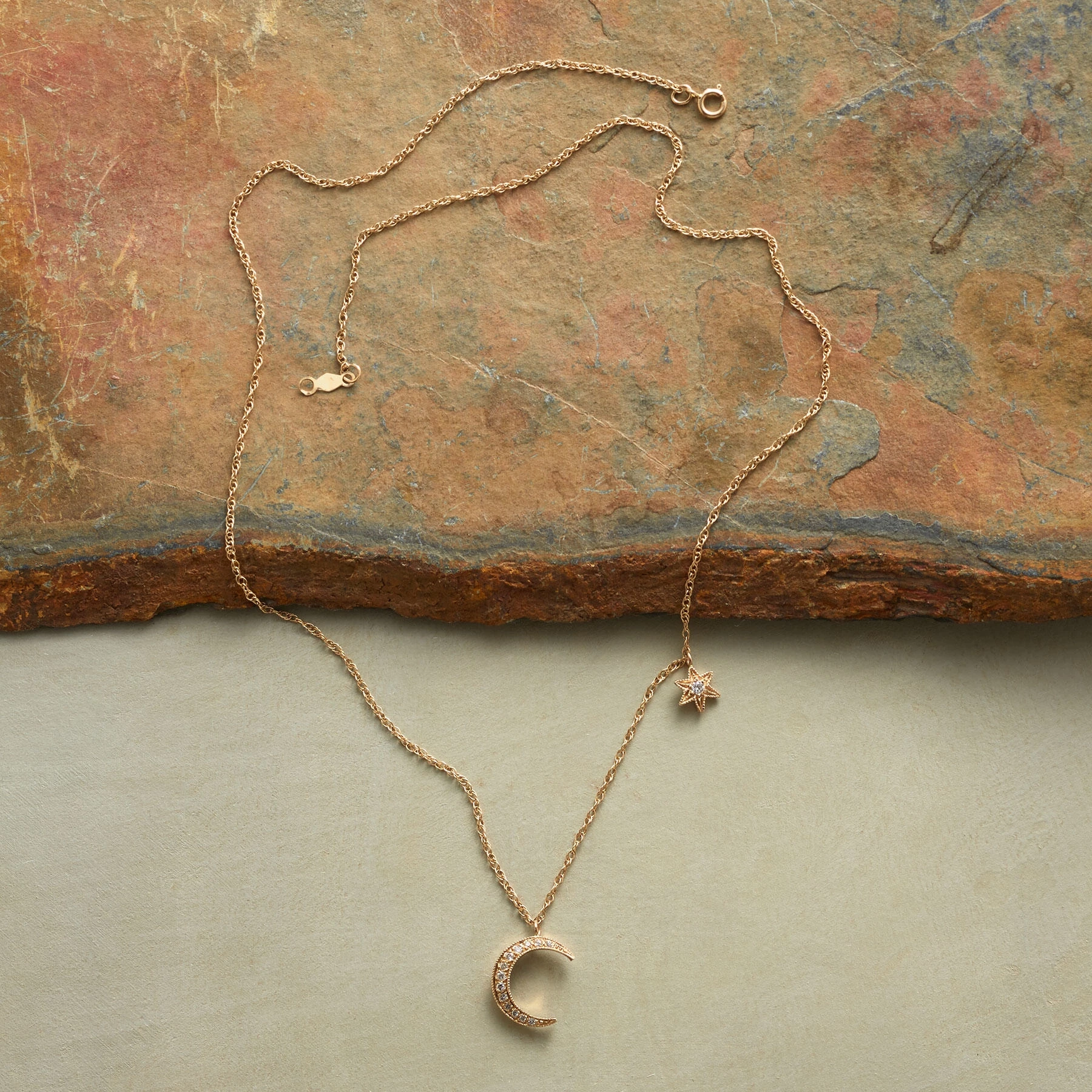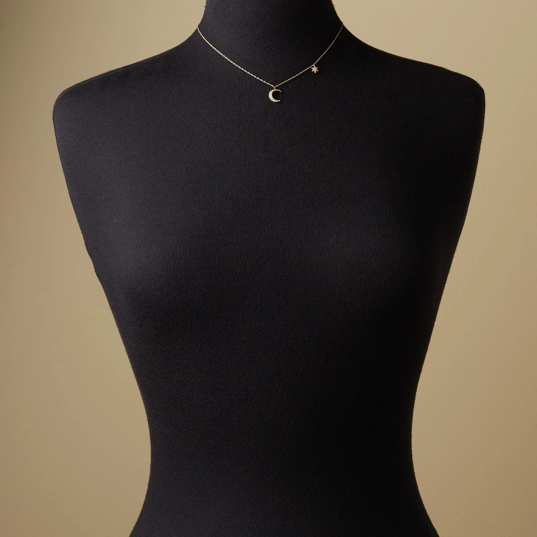 A diamond-encrusted crescent moon glides along this necklace chain by Julie Romanenko. Above, a star to wish on blinks with its own diamond sparkle. Spring ring clasp. Handmade in USA of 14kt gold. 16″L.
