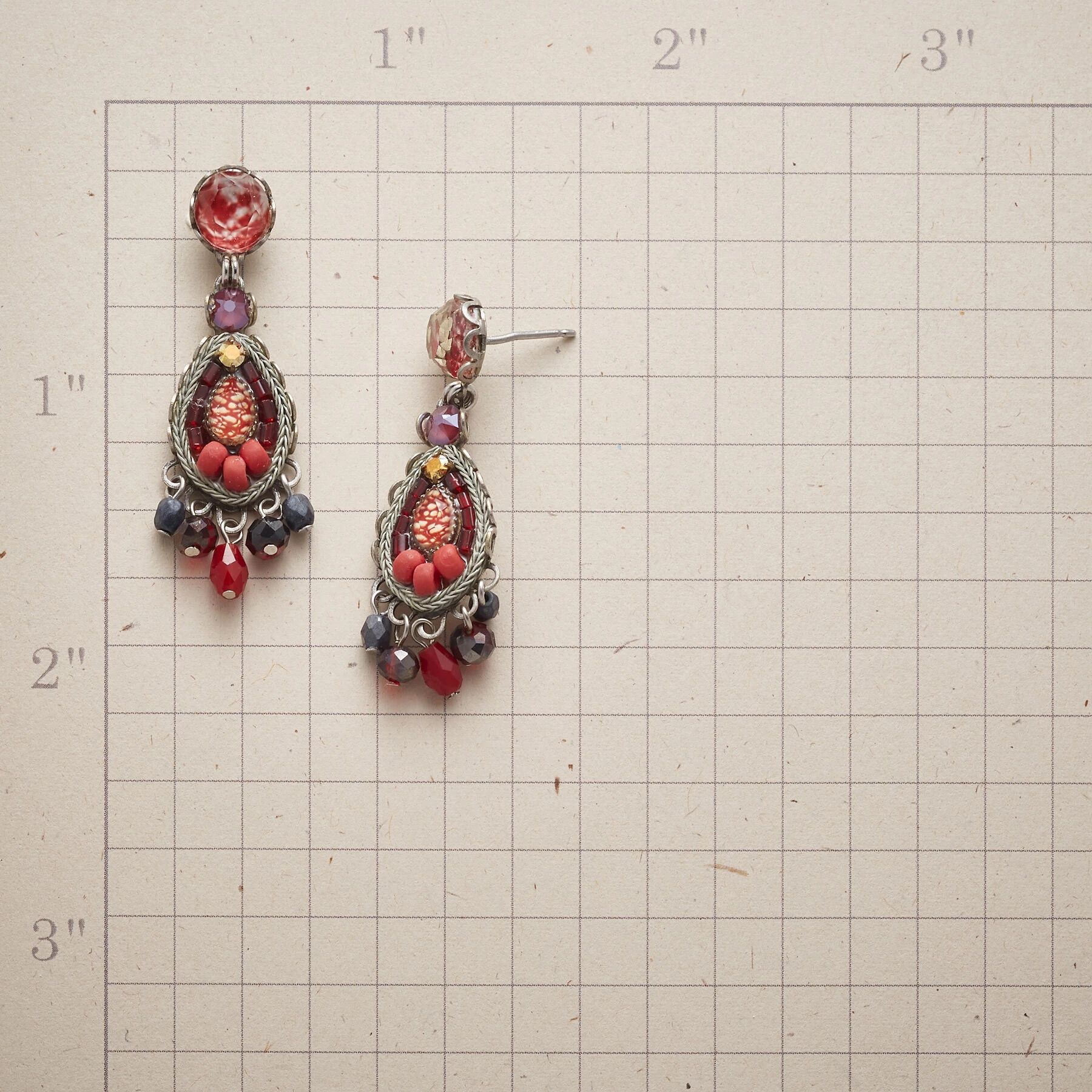 A study in shades of the heart with cut crystal, glass and ceramic beads and printed art paper intricately handcrafted. Posts. Nickel-free, silver-plated metal. Exclusive. Approx. 1-1/2″L.