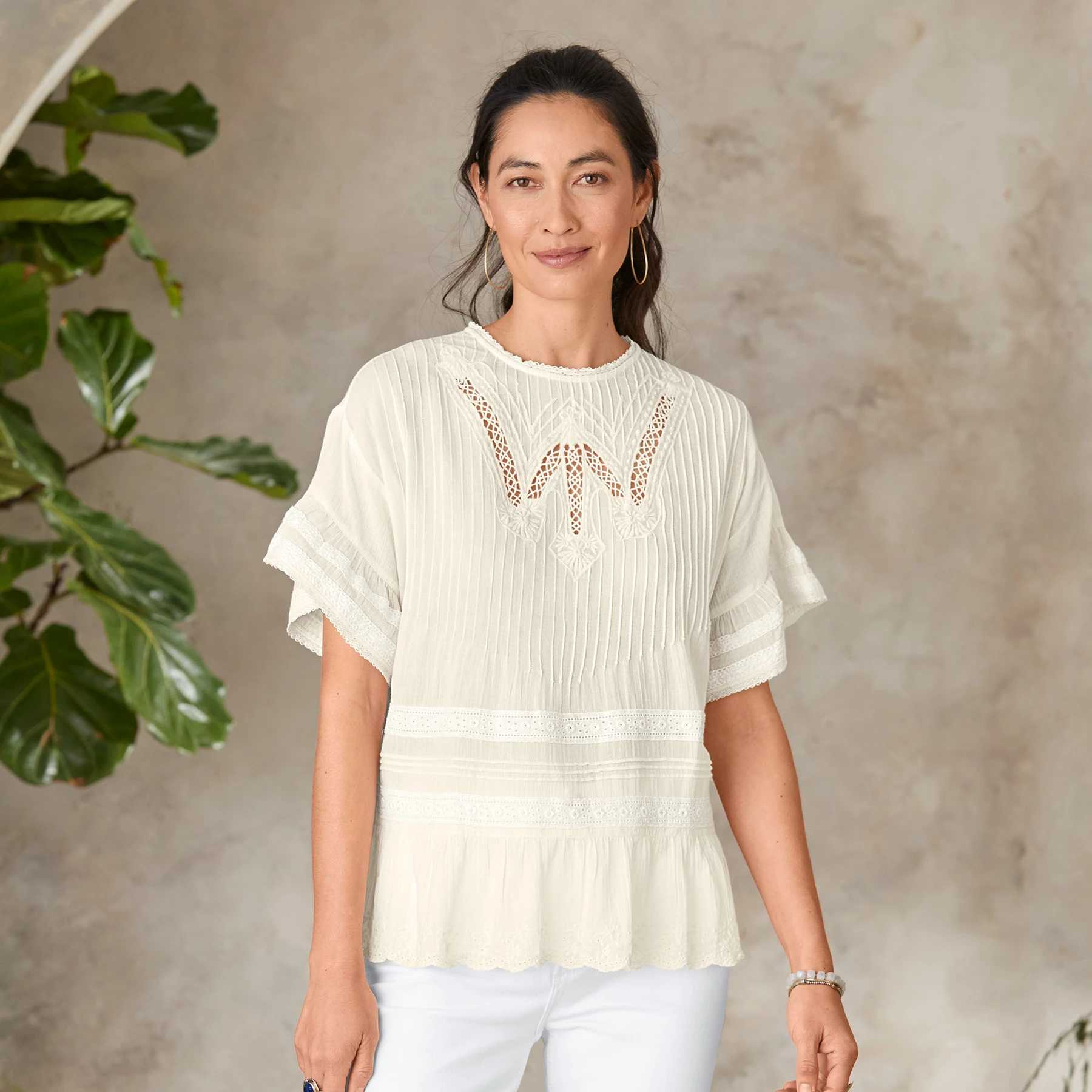 Delicate, timeless elements of pintucking, inset lace and flutter sleeves invoke the elegance of yesteryear. Cotton. Machine wash. Imported. Sizes 2 to 12. Approx. 25-1/2″L.