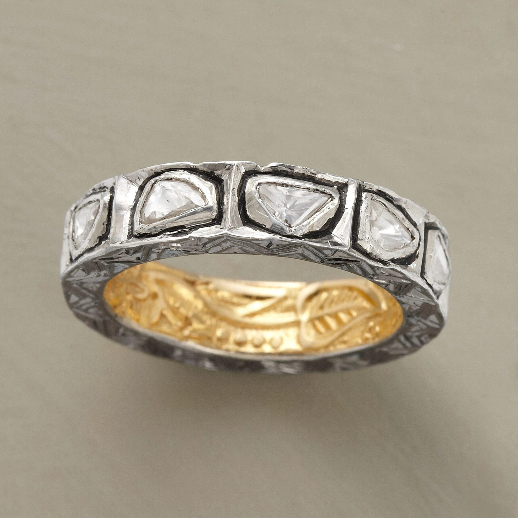 Randomly shaped, uncut diamonds encircle our exclusive ring, each ensconced in its very own niche. Sterling silver polished inside with 18kt gold highlights. Whole sizes 6 to 9.