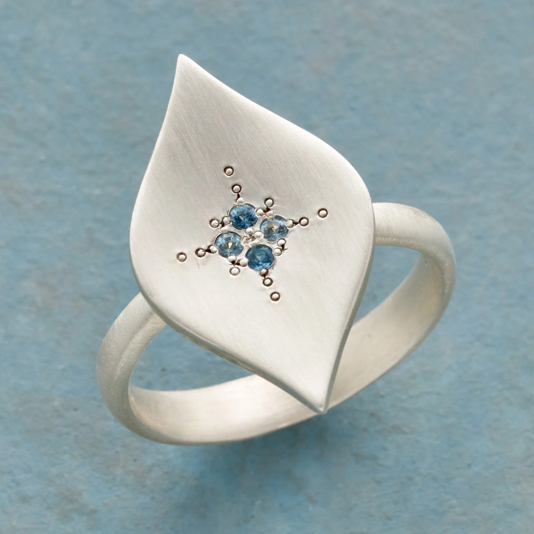 Graceful curves come to a point at the top and bottom of Adel Chefridi’s design, sparked with aquamarine and etched with bubbly accents. Handmade in USA of satin-finished sterling silver. Whole sizes 5 to 8.