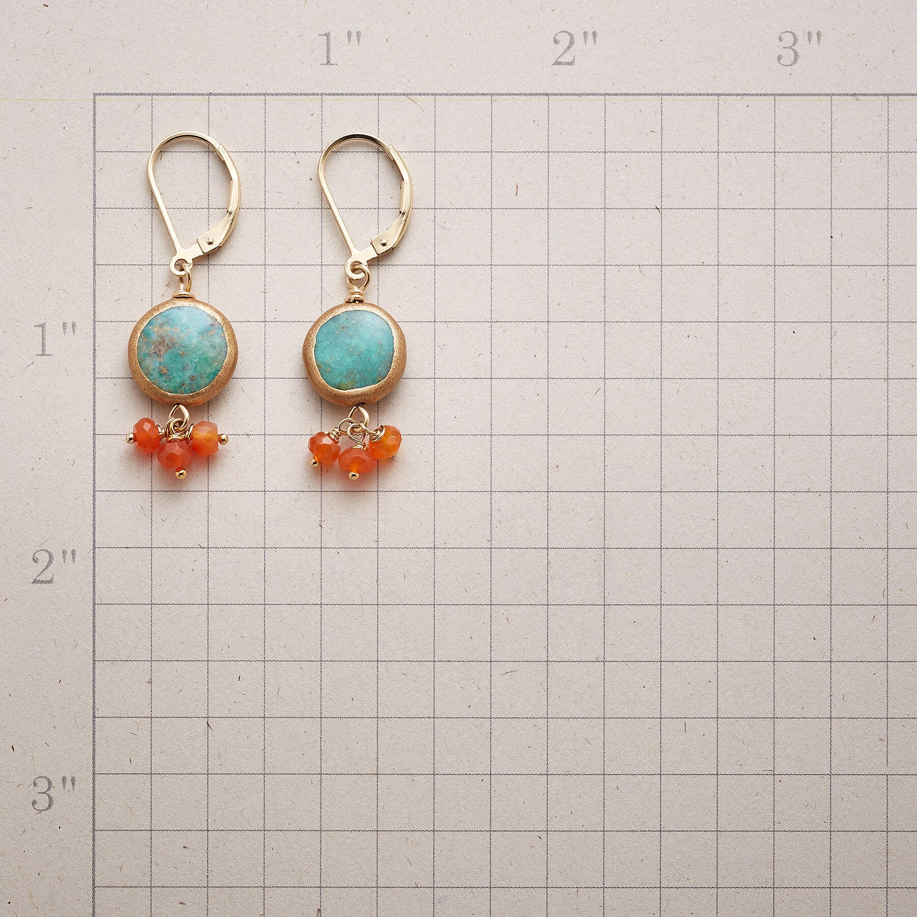 Copper-wrapped turquoise disks provide an earthy contrast to clustered carnelian rondelle trios hung below. 14kt gold-filled lever backs and wires. Exclusive. Handcrafted in USA. 1-1/2″L.