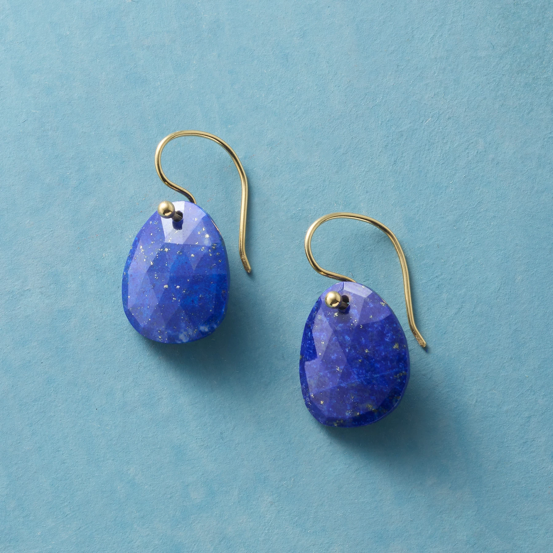 Anne Sportun’s minimalist design lets the natural beauty of lapis reign. Faceted on both sides, the gems are threaded on 14kt gold French wires that complement the gilded flecks within the deep blue stone. Handmade. 7/8″L.