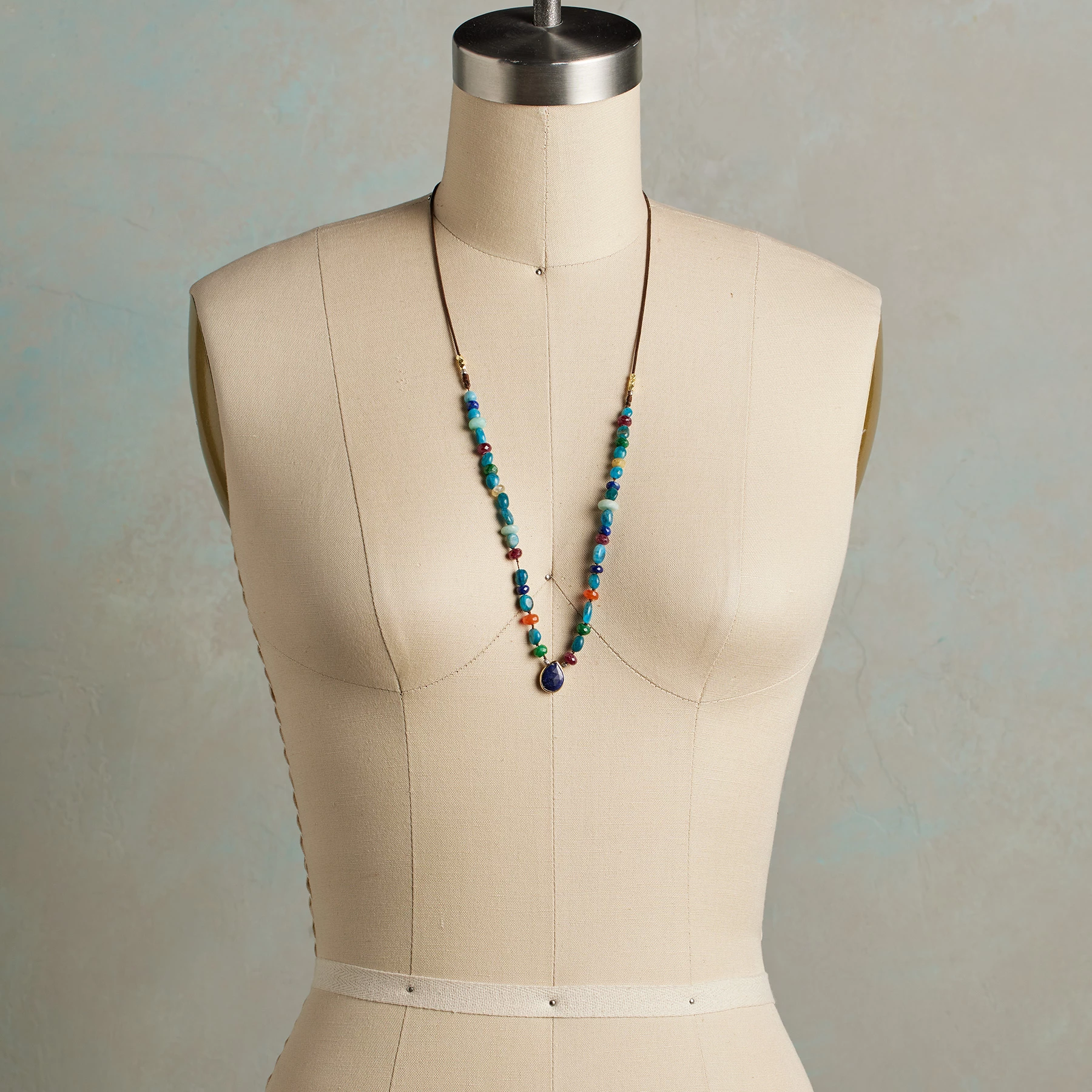 The cool, oceanic hues of apatite, lapis and enhanced emerald are warmed by carnelian, enhanced ruby and more as Thai silver and 14kt gold-plated accents throw sparks. Slider knots let you adjust the length. Handmade in USA. Exclusive. 14″ to 26″L.