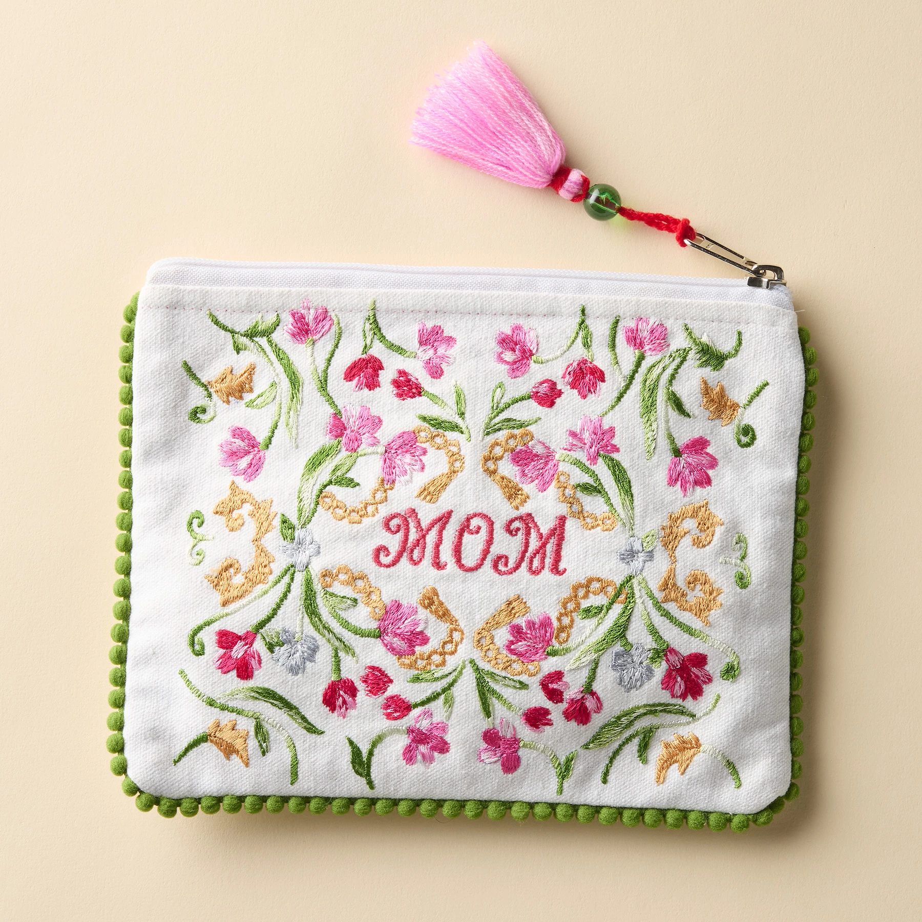 To hold treasures, to present a gift, to let her know she is the best mom ever. Handcrafted with a snapped leather earring and ring keeper inside. Zippered closure. Fully lined. Cotton. Exclusive. 8″W x 6″H.