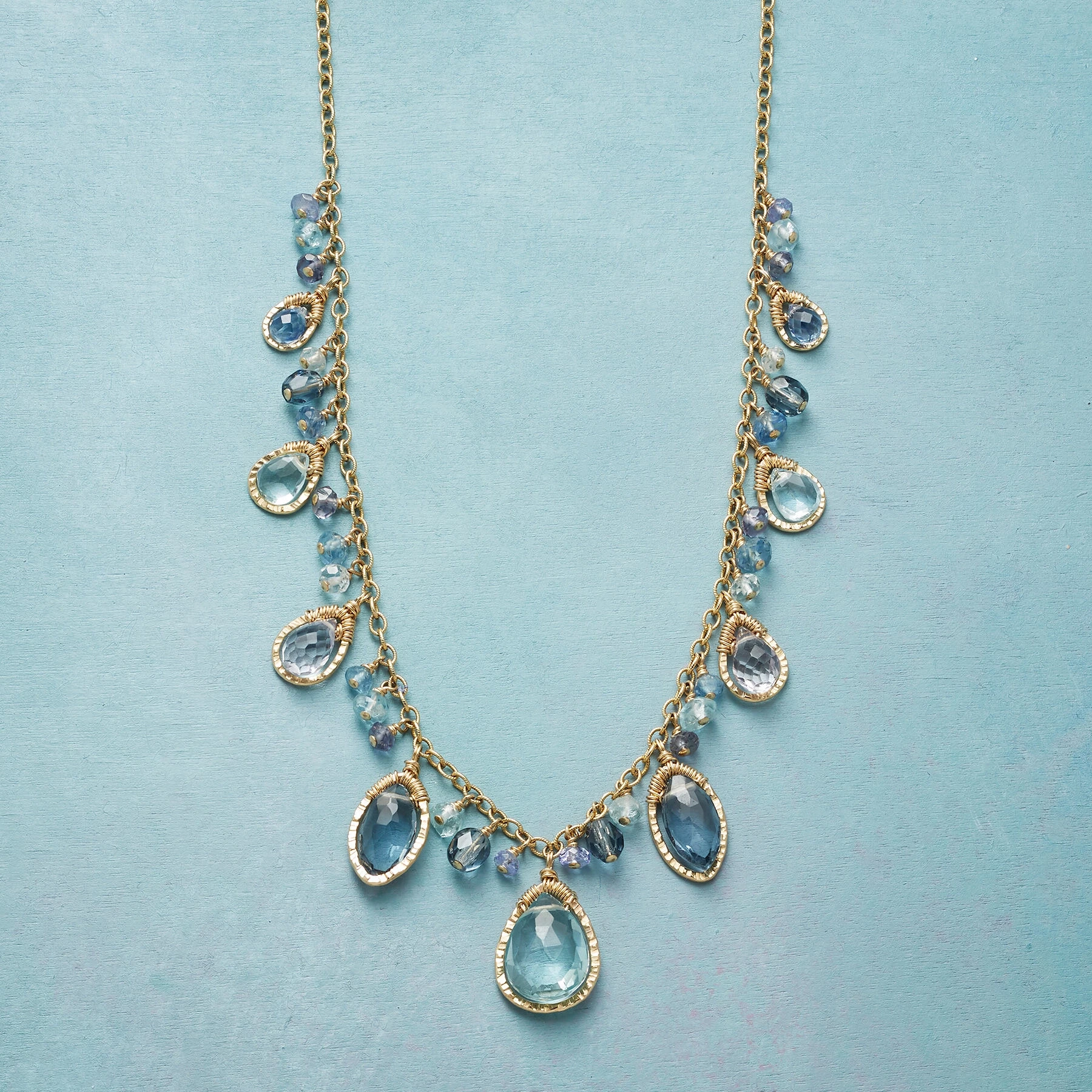 Blue quartz, kyanite and more come together with Dana Kellin’s delicate touch, some set apart with crimped, wire-wrapped rims. 14kt gold filled. Handmade in USA. Lobster clasp. 17-1/2″L