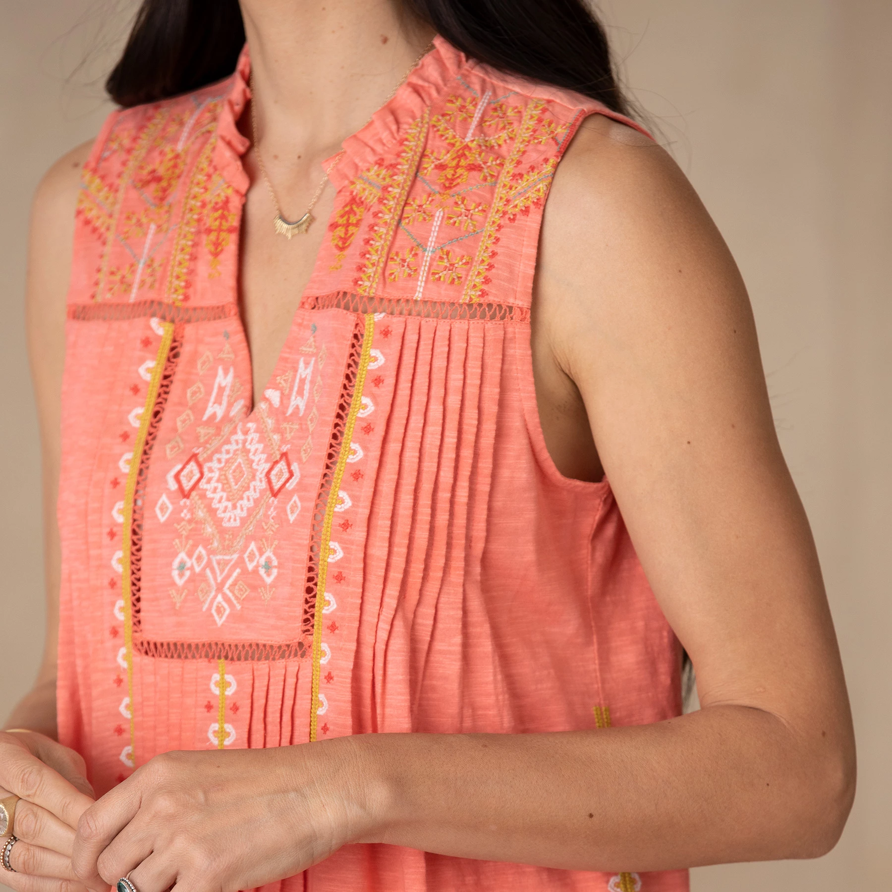 Flowing, A-line top in soft cotton slub with notch neckline, geometric embroidery, ladder lace inserts, pintucks, raw-edge ruffle detail and side slits. Machine wash. Imported. Exclusive. Sizes XS (0 to 2), S (4 to 6), M (8 to 10), L (12 to 14), XL (16 to 18), XXL (20 to 22). Approx. 27″L.