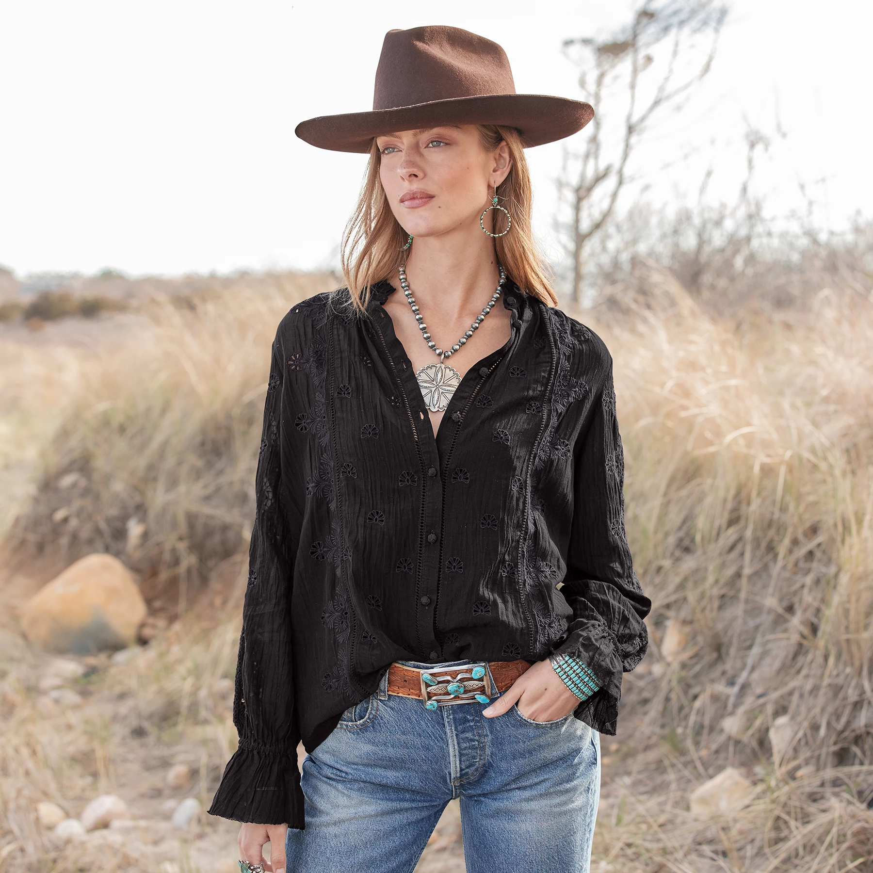 Allover floral embroidery graces our artistic ruffle sleeve top with shirring and ladder lace detail. Cotton/viscose. Hand wash. Imported. Exclusive. Sizes XXS (00), XS (0 to 2), S (4 to 6), M (8 to 10), L (12 to 14), XL (16 to 18). Approx. 24-1/2″L.