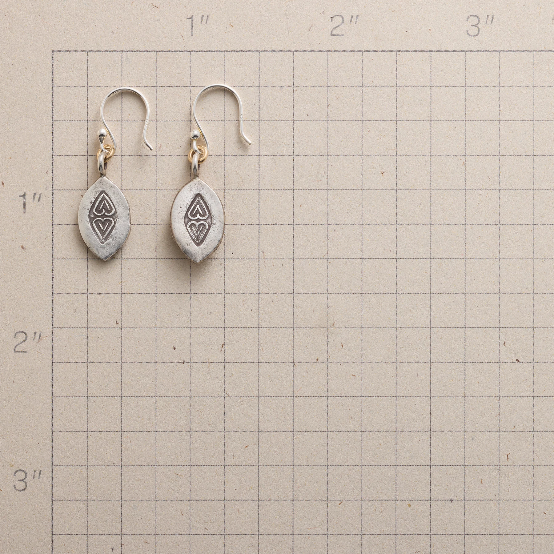 Hill tribe artisans stamp Thai silver tabs with companion hearts that pop as a pair from their oxidized background. Handmade with 14kt gold filled jump rings, sterling silver French wires. 1-1/4″L.