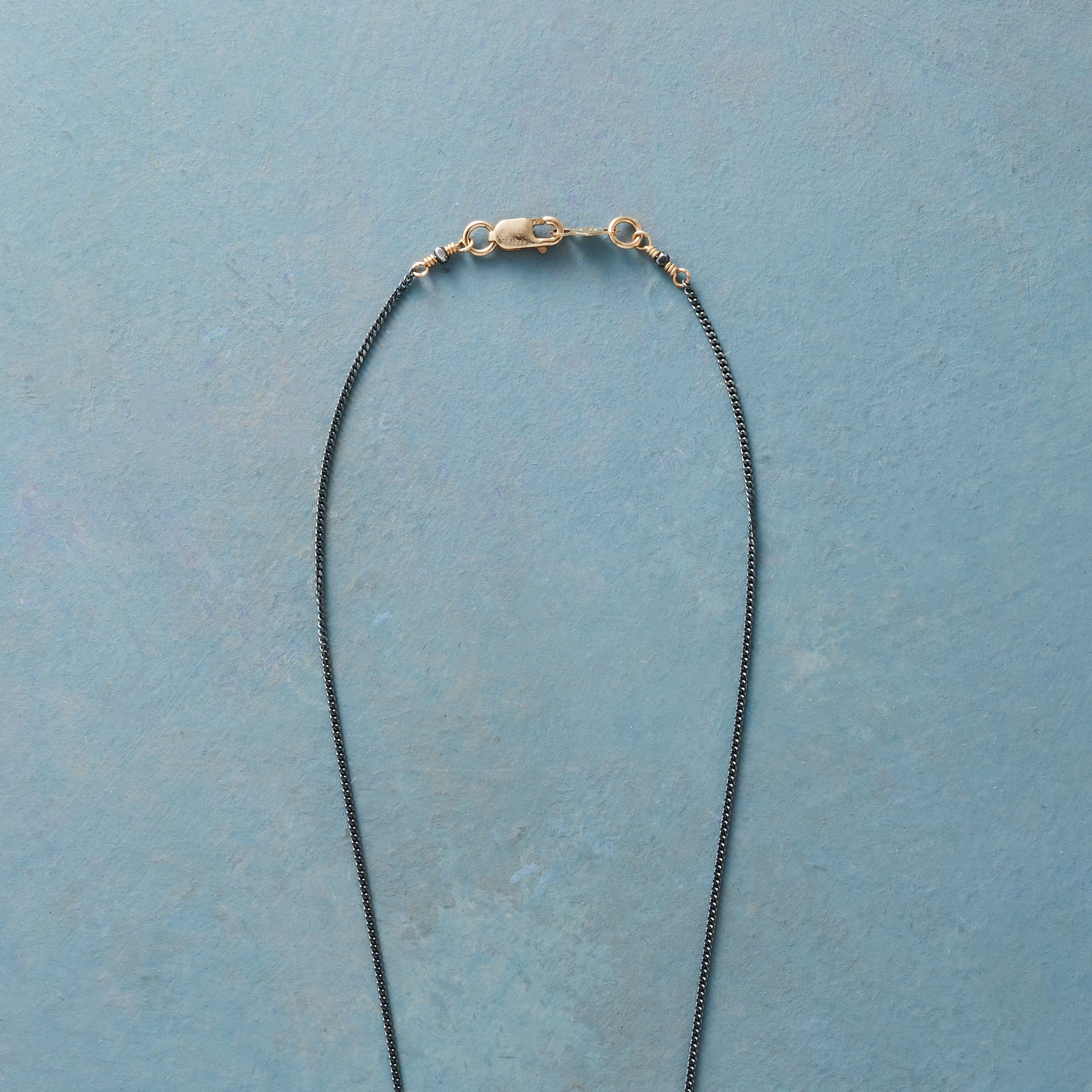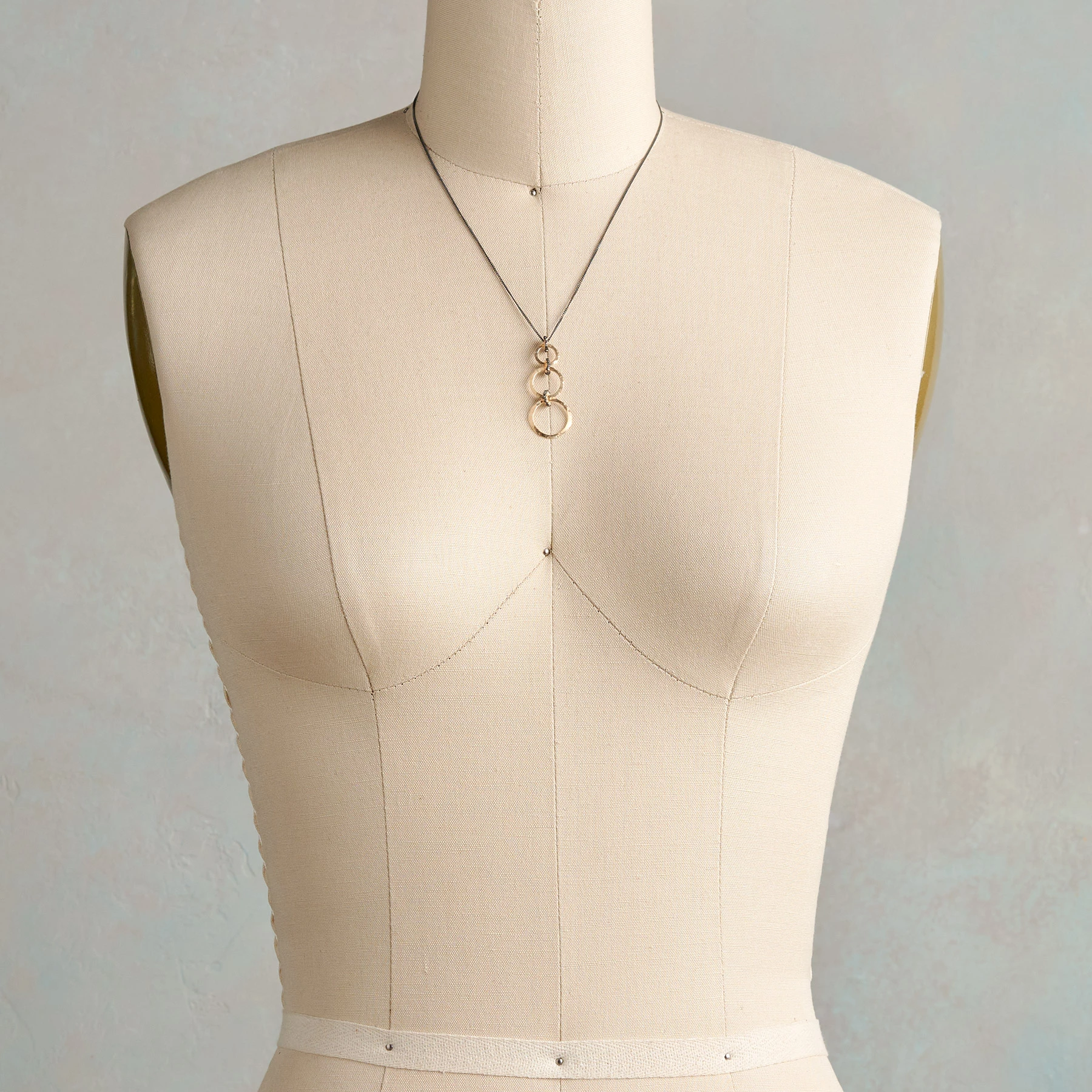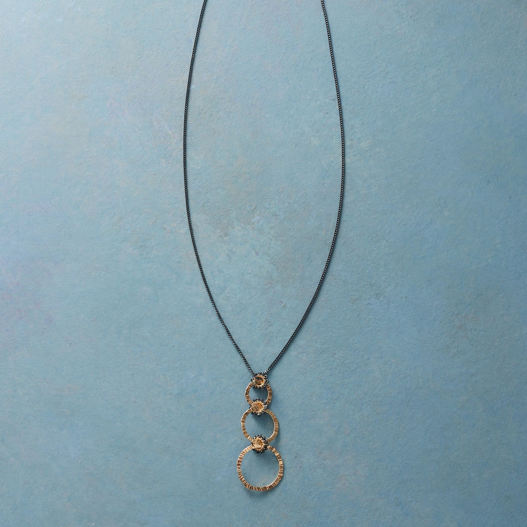 Dana Kellin’s attention to detail shines in this piece, which pairs three textural 14kt gold-filled rings with three links hand beaded with tiny oxidized sterling silver cubes. Light and airy, yet strikingly sculptural, the pendant is threaded onto a fine oxidized sterling chain with a gold-filled lobster clasp. Handmade in USA. 17″l. 1-5/8″ drop