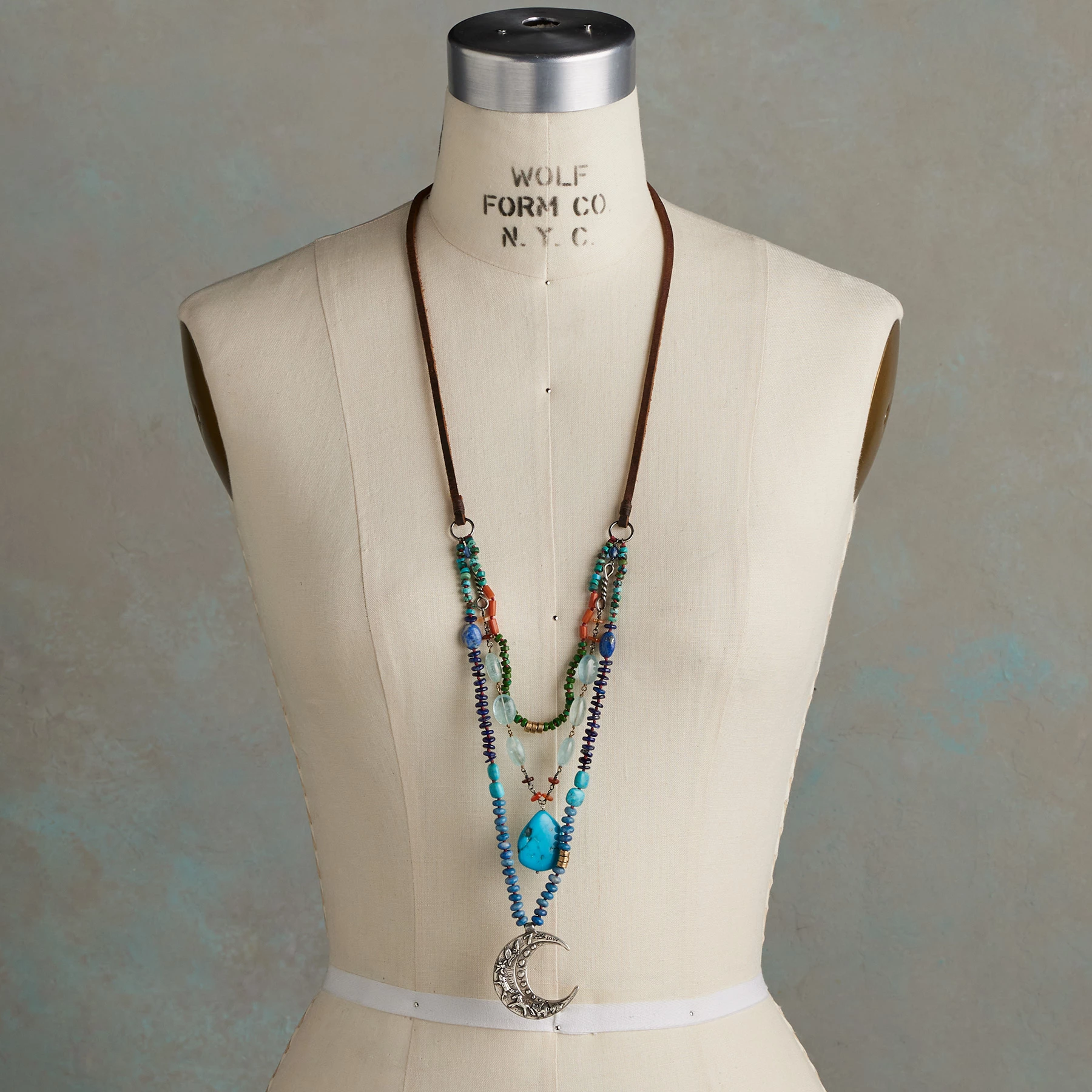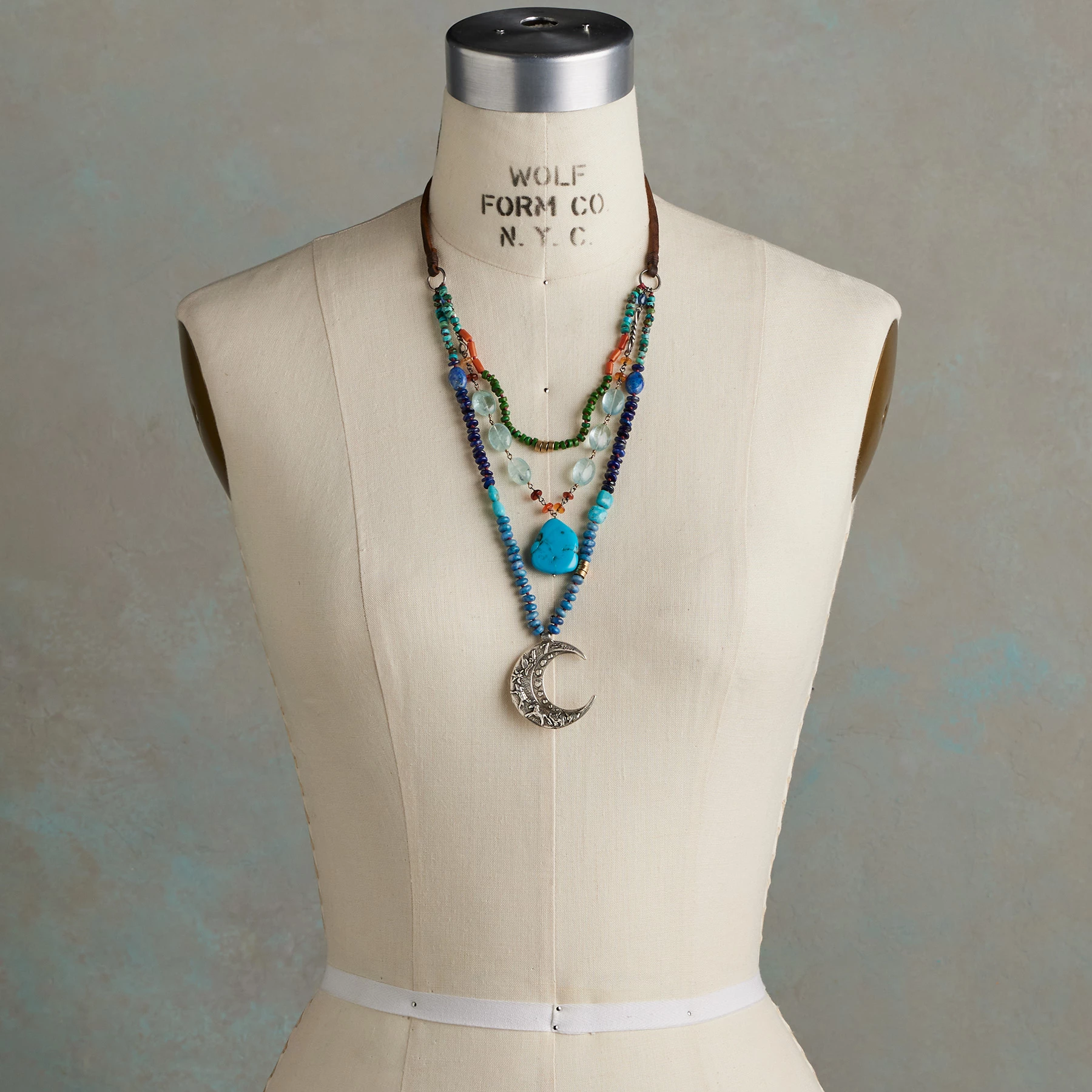 Jes MaHarry’s sterling silver crescent moon trails a tide of vibrant gemstones in its wake, including lapis, aquamarine, Mexican fire opal, pink sapphire and more. Animals dance along the moon’s curve while a large chunk of Kingman turquoise and a carved turquoise leaf dangle from the beaded strands. The pendant reads “Love Beyond the Moon” on the back. Leather laces adjust with a sterling slider. Handmade in USA. Exclusive. 32″L, 1-5/8″ dia. moon.