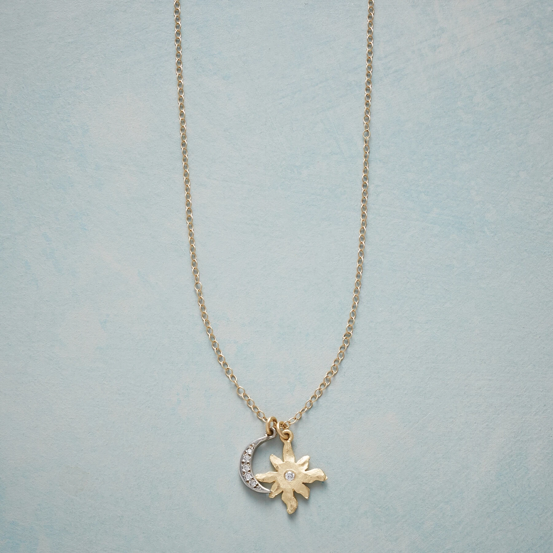 Victoria Cunningham’s celestial charms make a heavenly pair as diamond illuminates a freeform sun and crescent moon in this ‘Day And Night’ necklace. Handmade in USA of 14kt white and yellow gold. Spring ring clasp. 16″L.