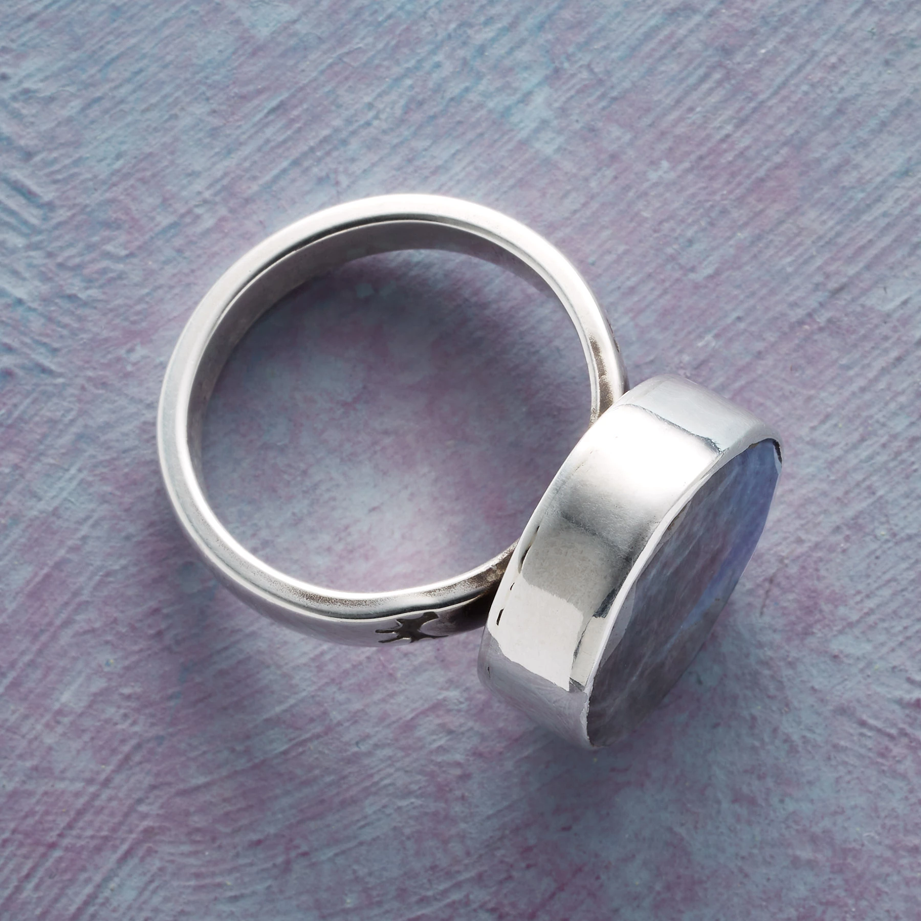 Irregular blue sapphire, faceted just around the rim, offers an unfettered view of the stone’s unique matrix. Exclusive. Handmade in sterling silver with stamped accents on band. Whole sizes 5 to 9.