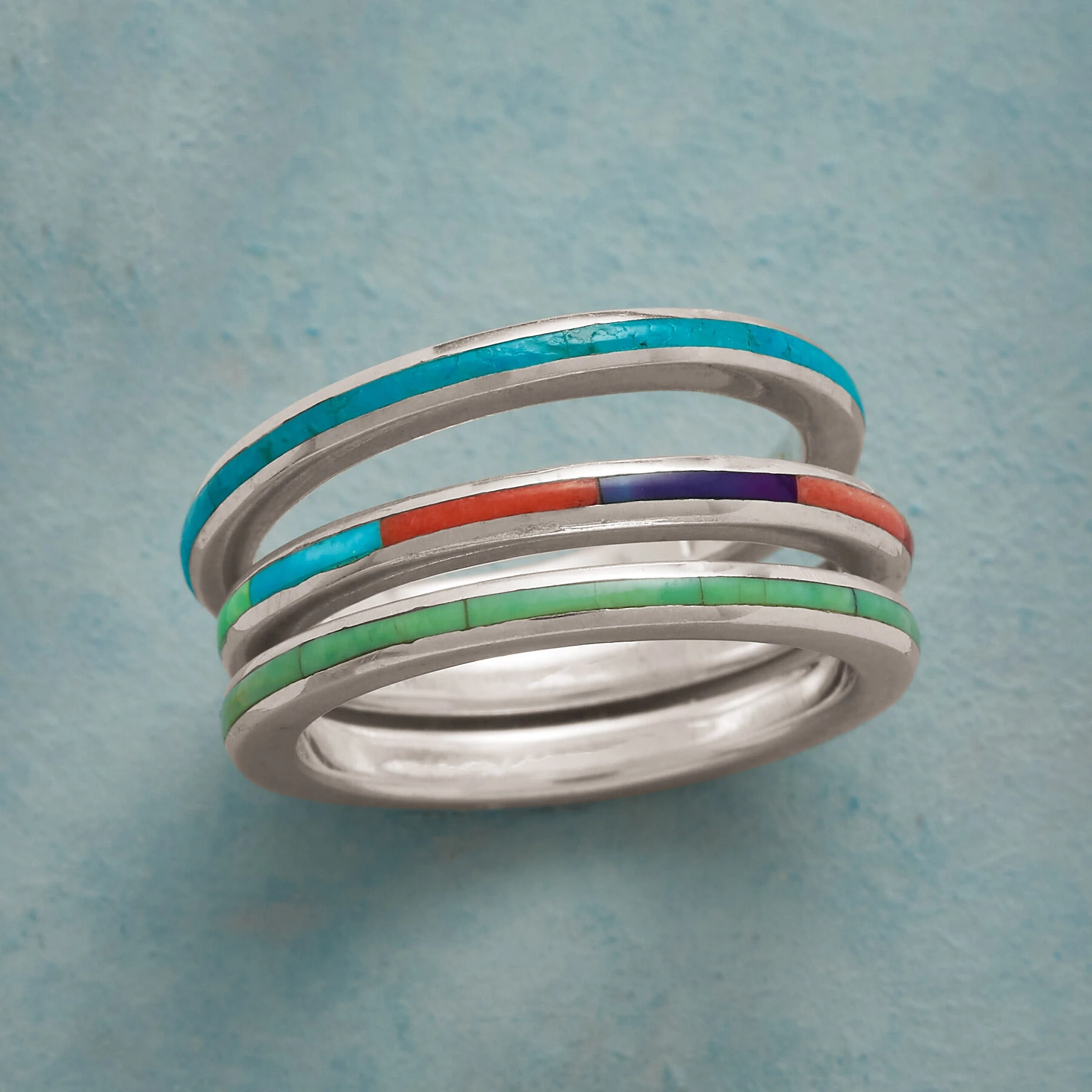 Three sterling silver bands—inlaid with green and blue turquoise, purple and orange spiny oyster shell and lapis—stack together in colorful harmony. Handmade. Exclusive. Whole sizes 5–9. Set of 3.