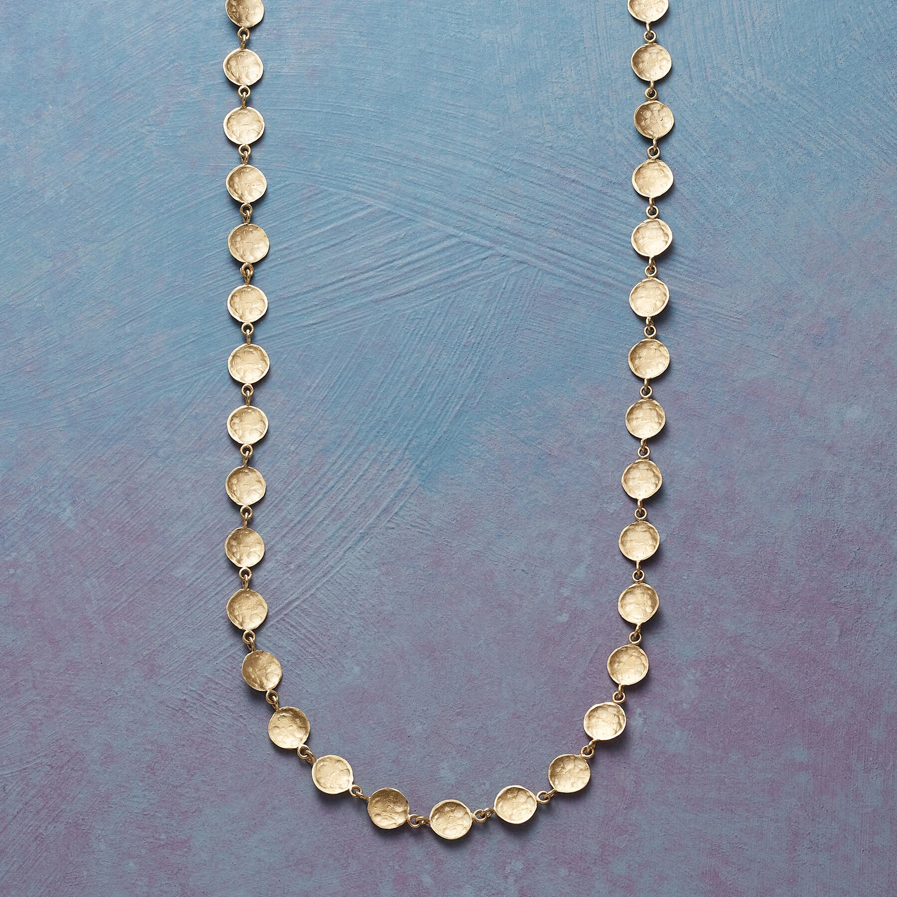 In an ever-changing display, concave disks of 14kt gold turn this way and that. One side is hammered, the other smooth, both burnished to a matte finish. Lobster clasp. Handmade by Anne Sportun. Exclusive. Adjusts 16 or 18″L.