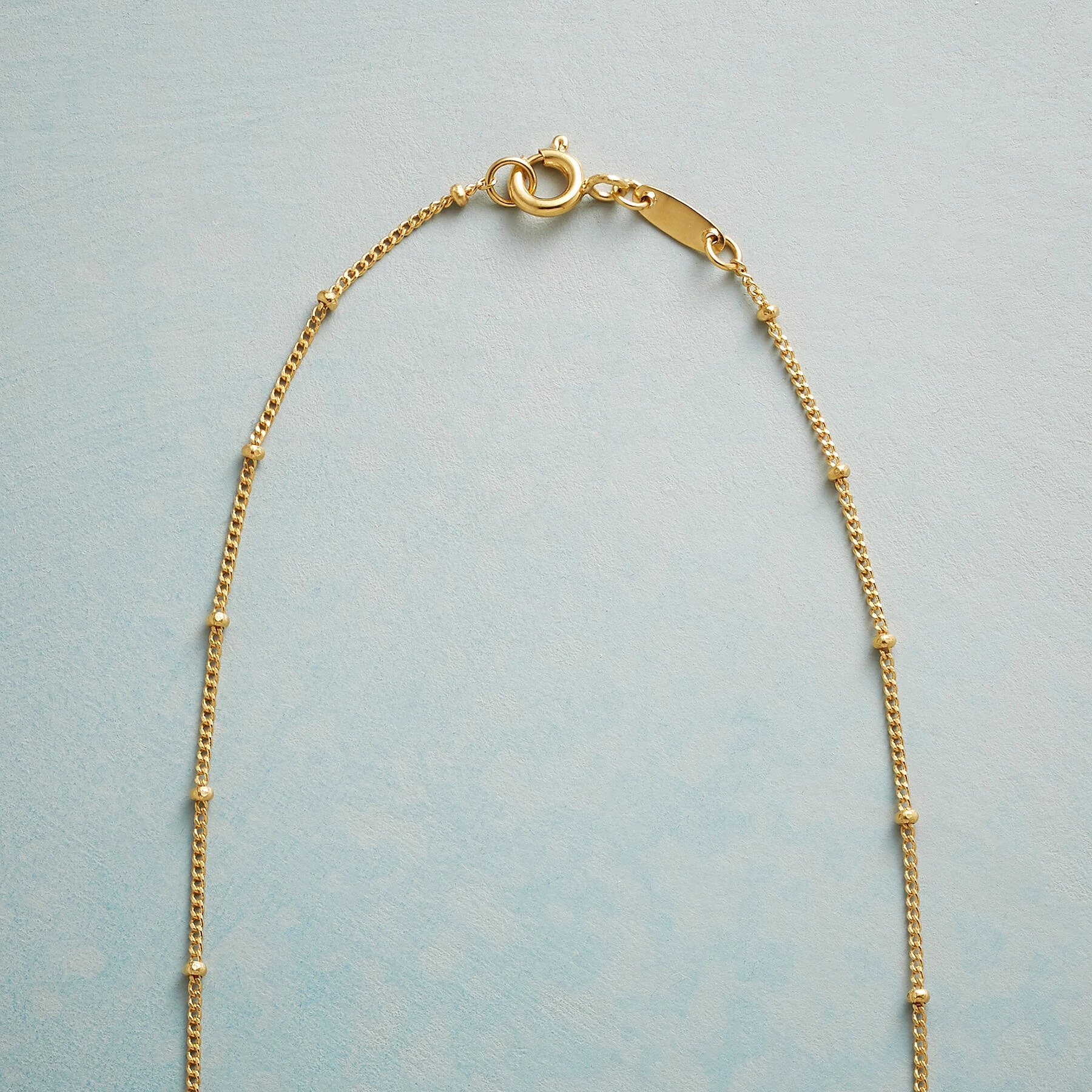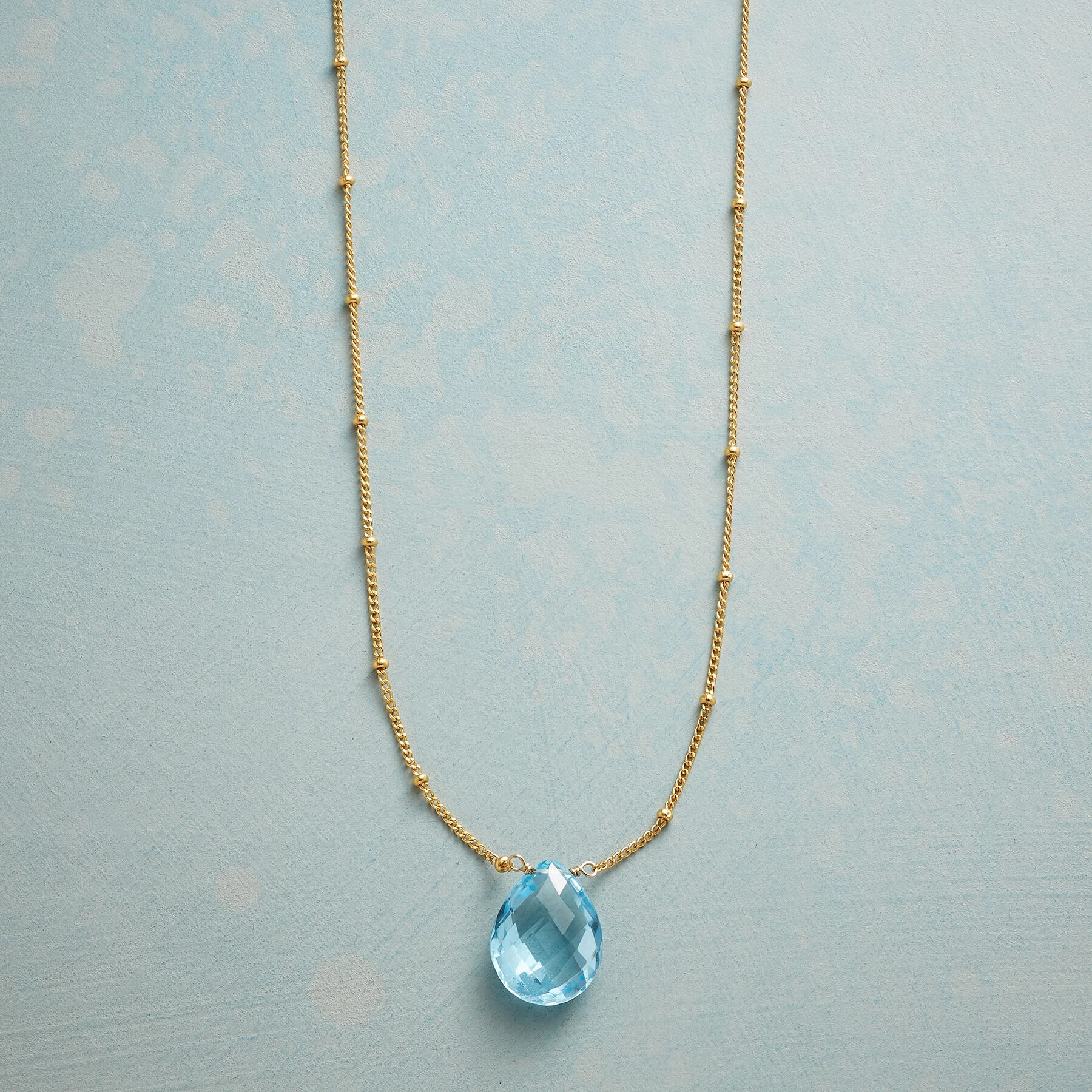 One droplet of lavishly faceted blue topaz embodies a sea of tranquility in this refined necklace. Handcrafted in USA on a beaded 18kt gold plated chain with spring ring clasp. 18″L.