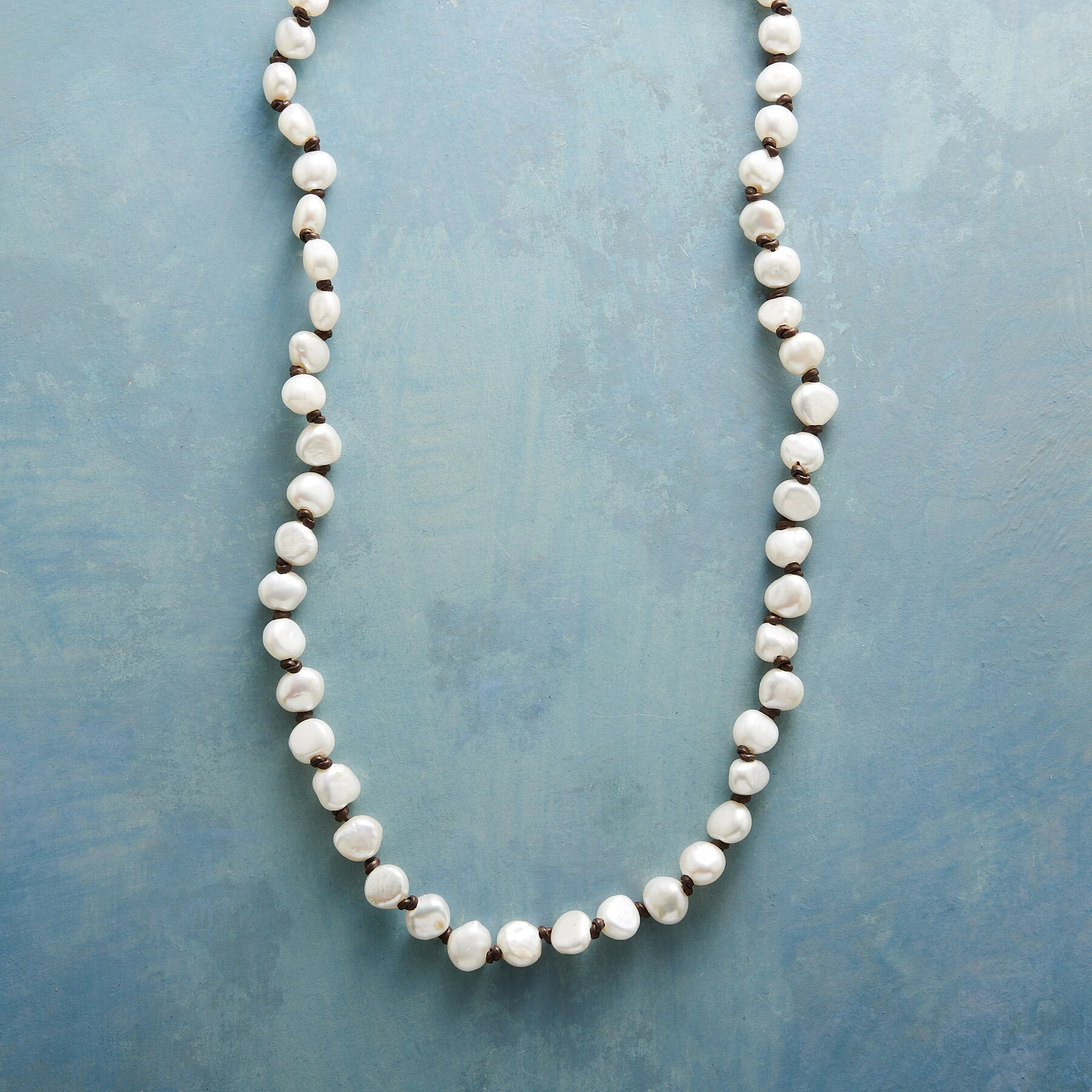 Reinterpreting a classic, our cultured freshwater pearl necklace is hand knotted with leather. Thai silver beads and toggle clasp. Exclusive. Approx. 20″L.