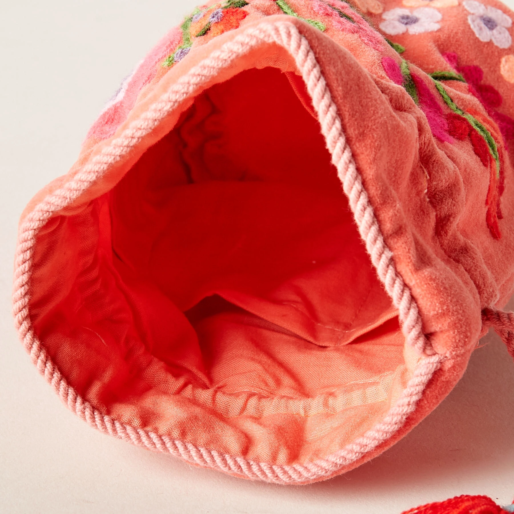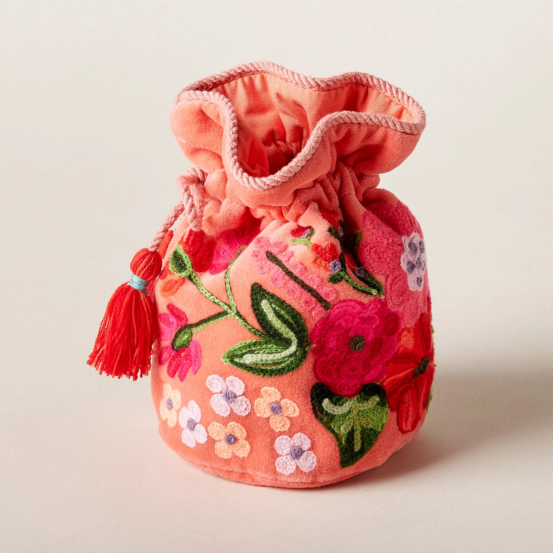 Made by hand, these plush velvet pouches make colorful work of safekeeping treasures. Drawstring pouch has inner slip pockets for rings and such. Cotton. Exclusive. 7-1/4″H x 4″ dia.