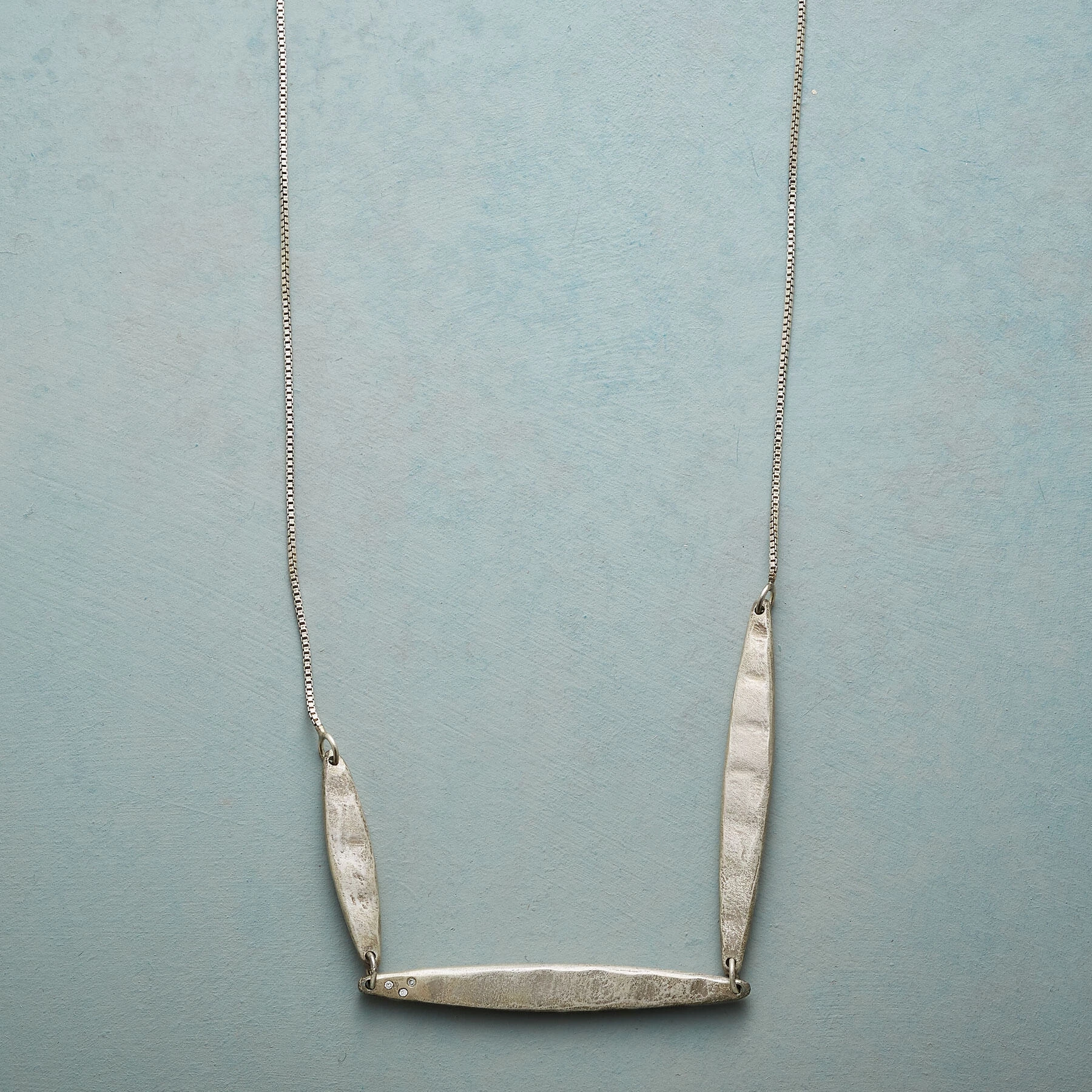 Nestled in hand-hammered sterling silver blades of grass are three diamonds, adding subtle sparkle to this simple, sculptural necklace by Saundra Messinger. Lobster clasp. Made in USA. 16″ or 18″L.