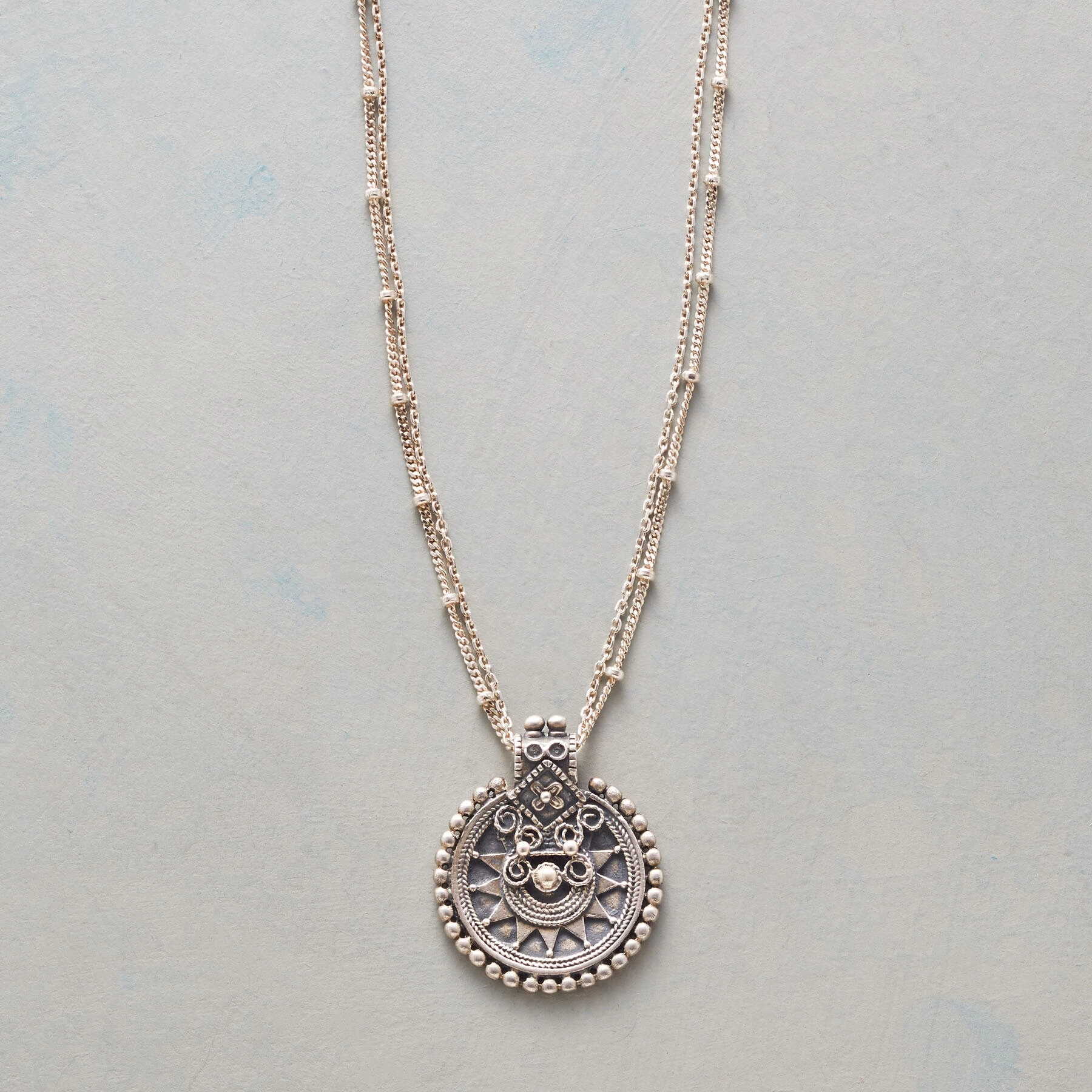 Bas-relief motif is an invitation to follow the sun, enhanced with oxidation and a border of granulation beads. Sterling silver; double chain; spring-ring clasp. 18″L.