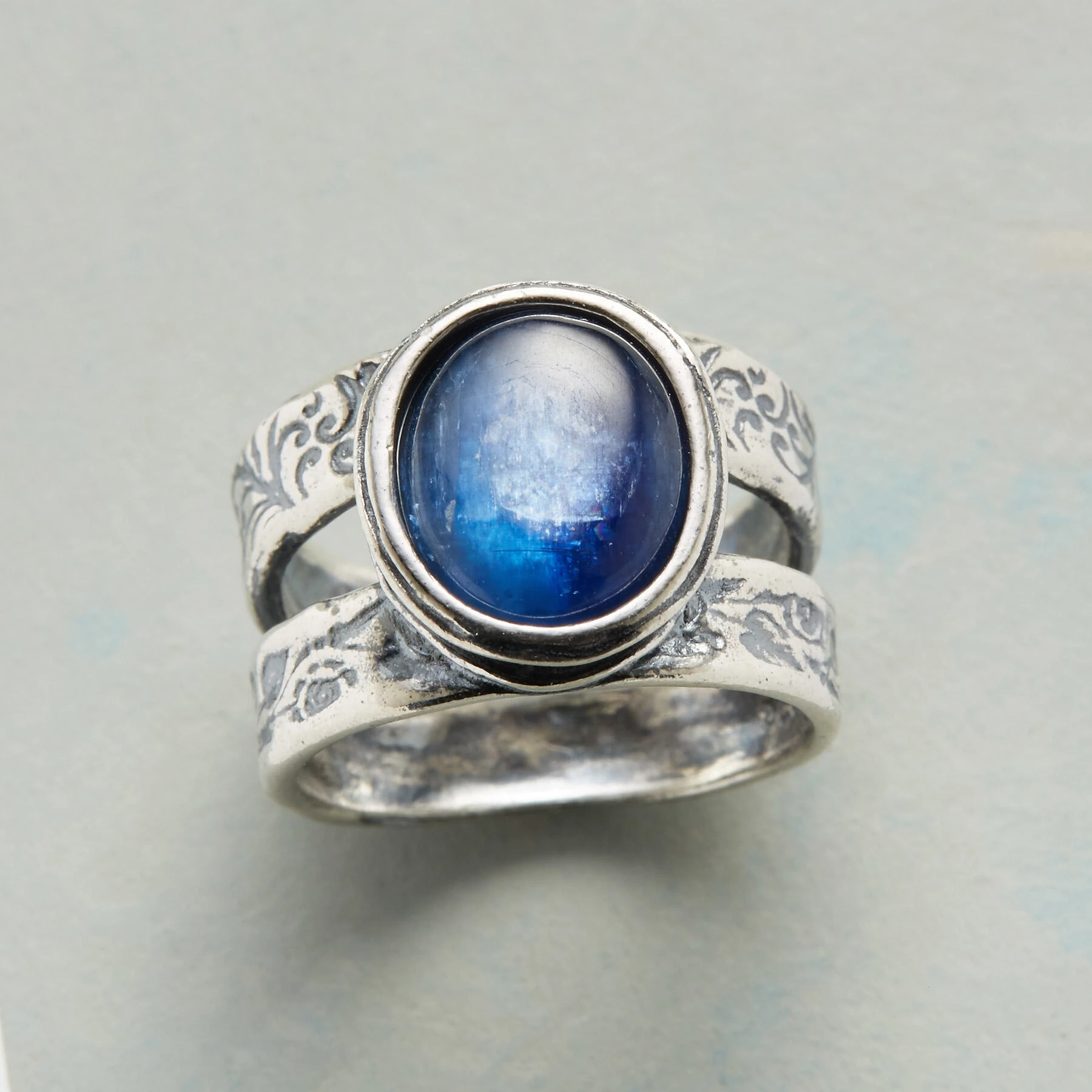 Named for a Norse goddess said to have the bluest eyes, this detailed and double-banded sterling silver ring is crowned with kyanite. Exclusive. Whole sizes 5 to 9. 1/2″W, tapers to 3/8″W.