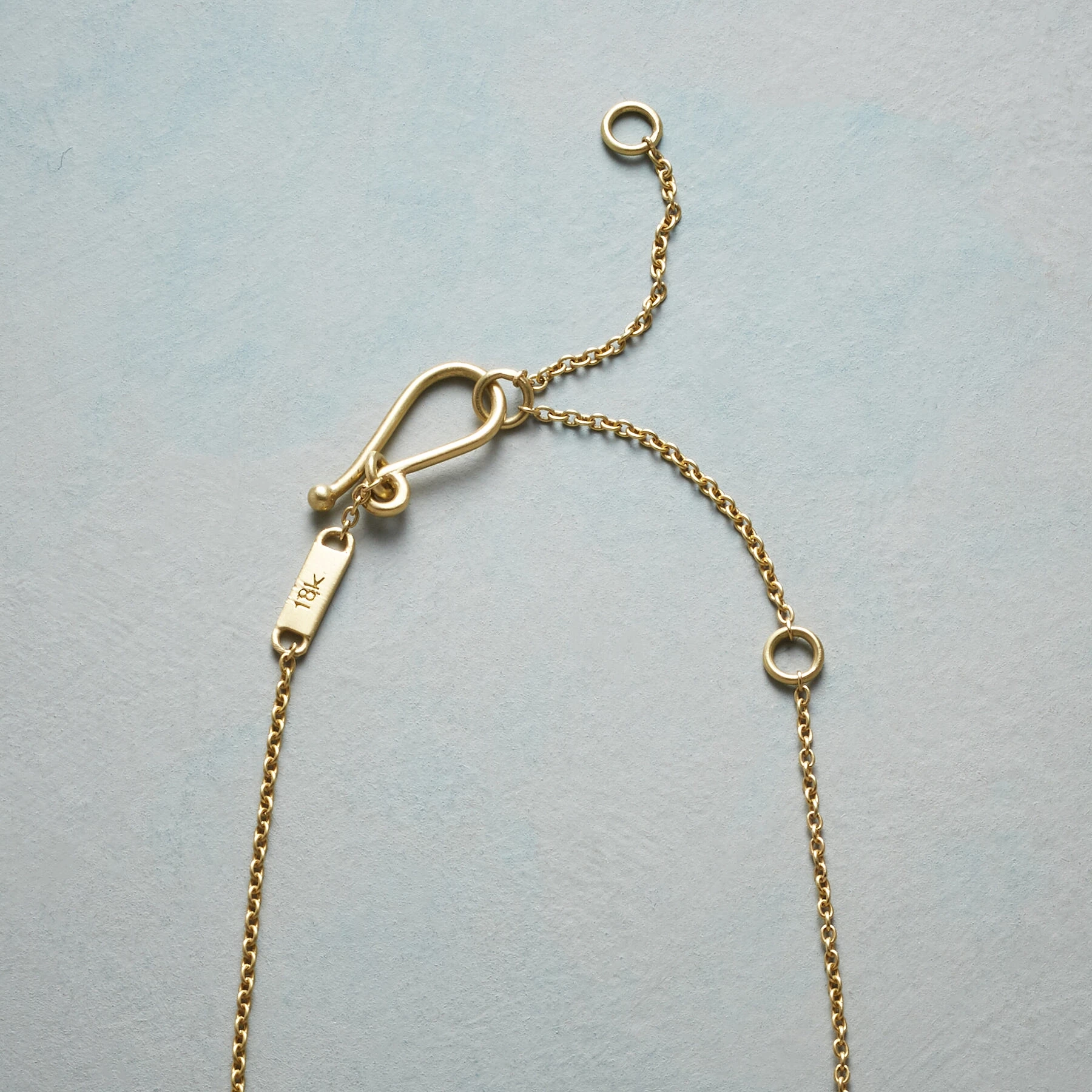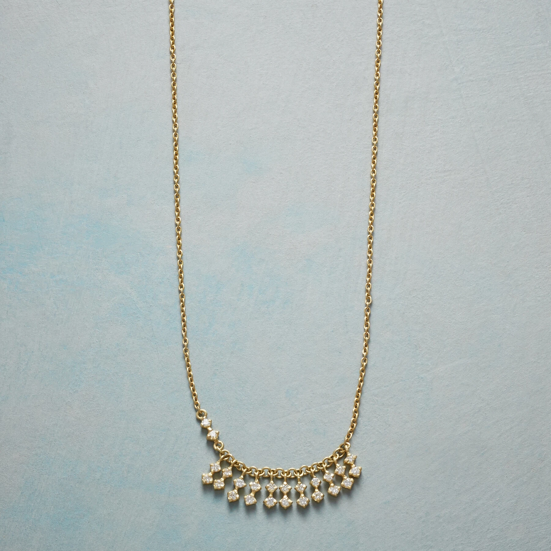 In this exquisite handcrafted necklace, pairs of prong-set diamonds gather in a glittering fringe, two more gems shimmer to one side. By Tej Kothari, 18kt gold with a hook clasp. Adjusts to 16″, 17″ or 18″L.