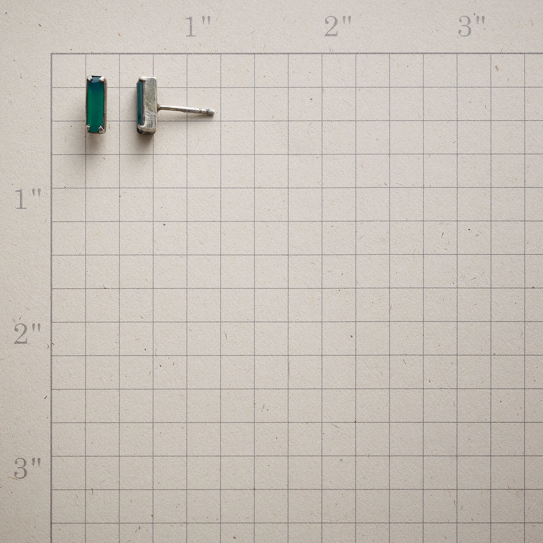 Jane Diaz places dainty faceted green onyx baguettes into an oxidized sterling silver bezel in her earrings, perfect for occasions ranging from casual to black tie. Handmade. Posts. 3/8″l.