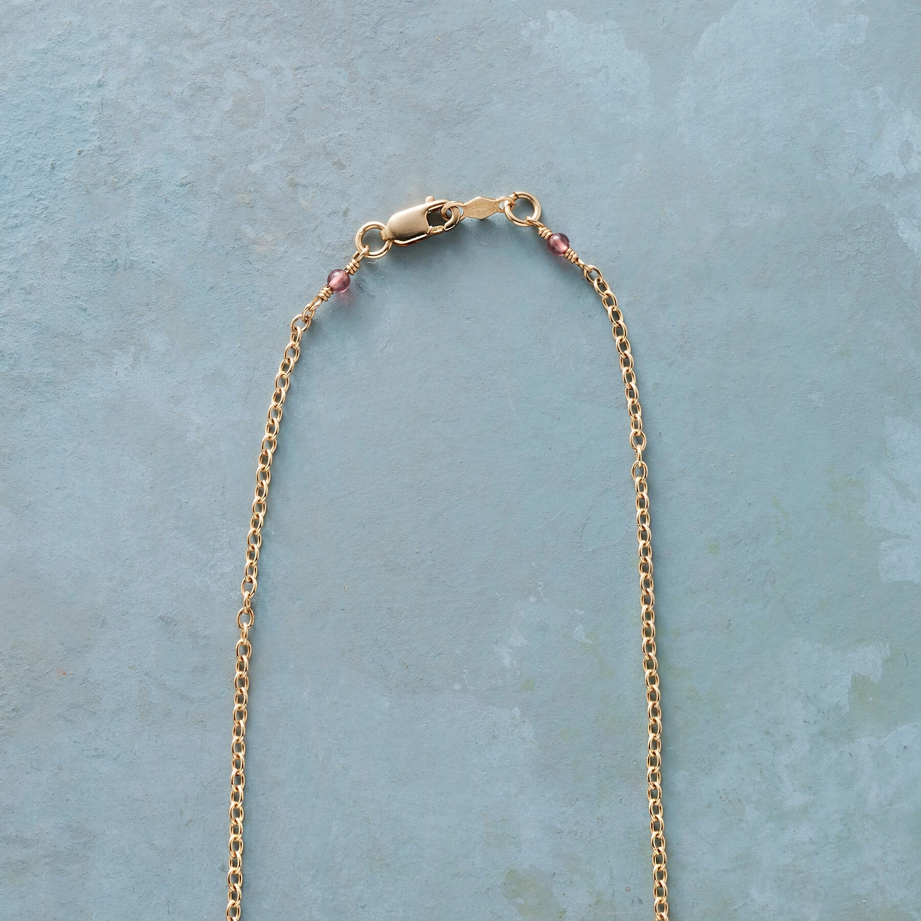 Dana Kellin’s garnet teardrops form a garland for the wearing. Each translucent red gem is outlined in hexagonal beads. Handmade in USA. 14kt gold filled. Lobster clasp. 18″L.