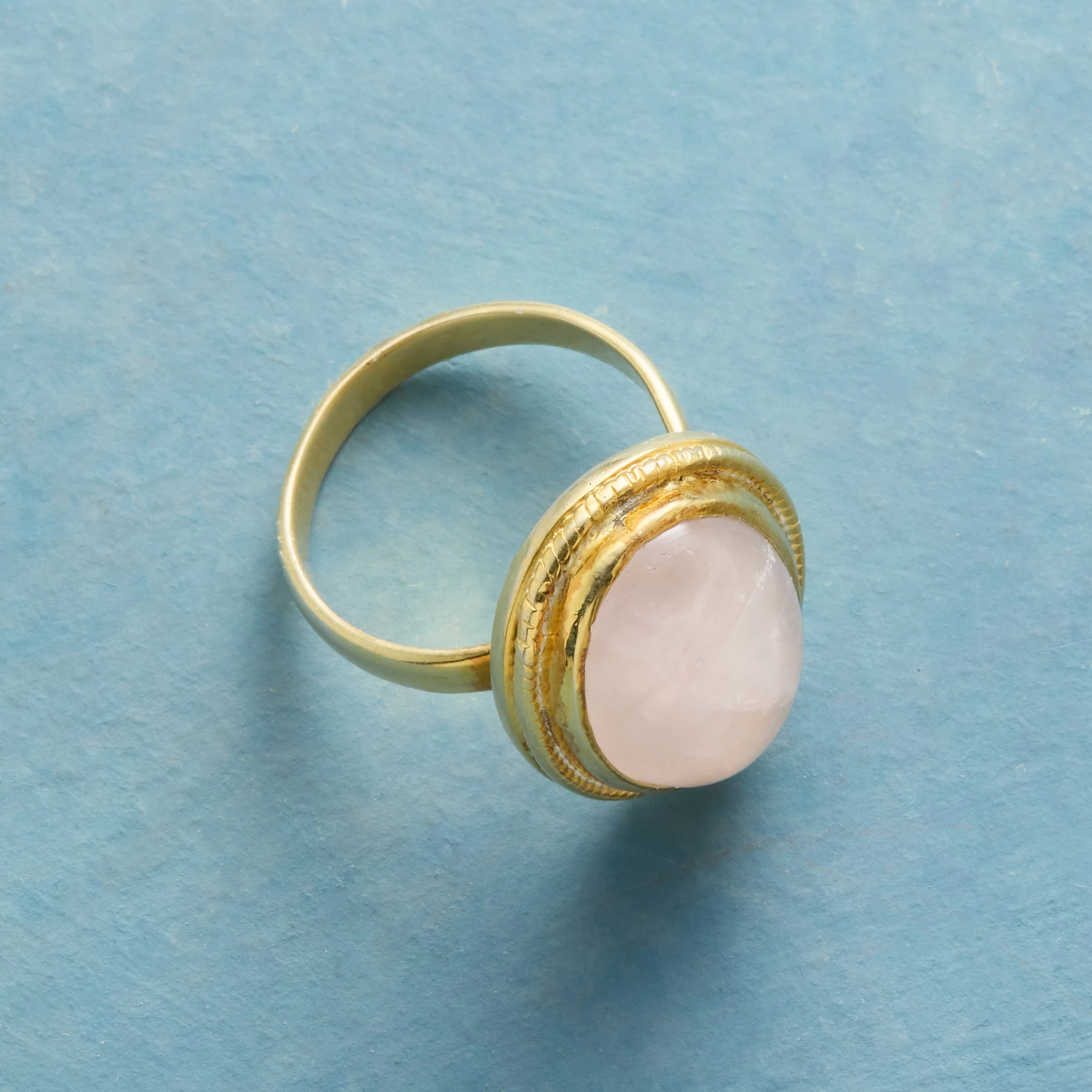 Surrounded by the glow of 14kt gold-plated sterling silver, a rose quartz cabochon swirls with soft radiance. The subtly detailed setting is set on a polished half-round band. Whole sizes 5 to 10.