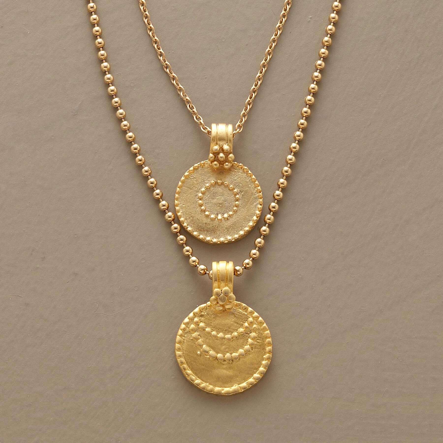 A golden sun and moon necklace, with charms of 24kt gold vermeil hand brushed to a matte finish representing the sun and moon. The necklace suspends one from each of two vermeil chains, one a ball chain, the other links; hook and eye clasp. Link chain 16″L; ball chain 18″L.