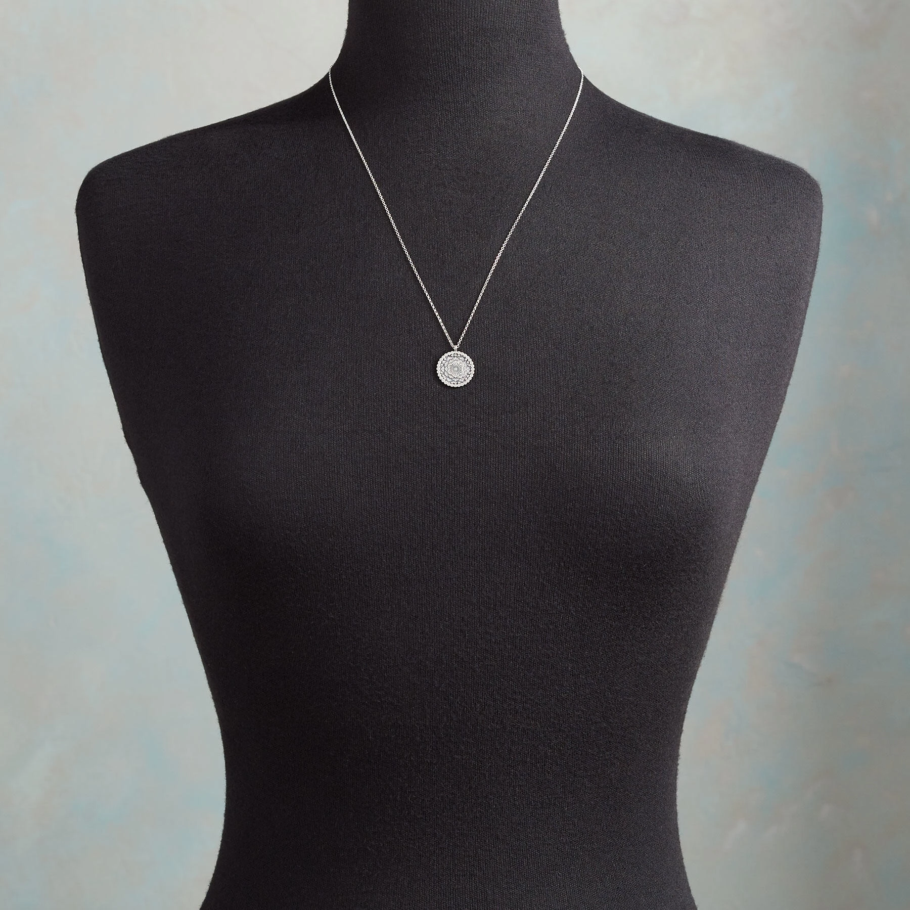 A mandala is a calming circle of overlapping layers, a symbol of wholeness often used in meditation and healing. Among our group of mandala necklaces is Gratitude, centered with a flower. Handcrafted in sterling silver. USA. 22″ sterling chain with spring ring clasp.