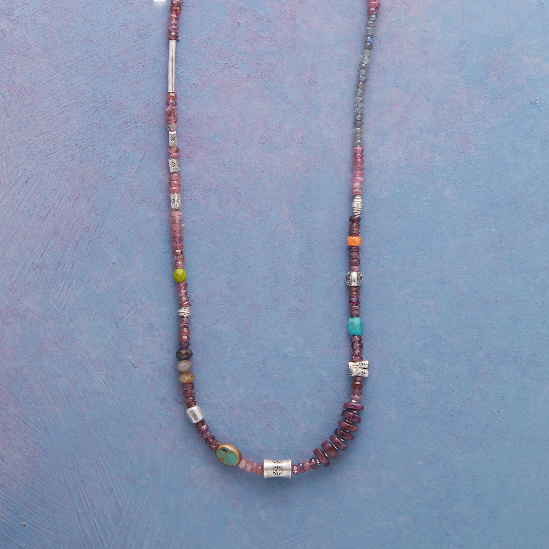 An artist’s ode to nature’s underwater wonders, rich with ruby, pink tourmaline, Thai silver beads and tinted stabilized turquoise wrapped in copper. Exclusive. Handmade in USA. Sterling silver lobster clasp. 16″ to 18″l.