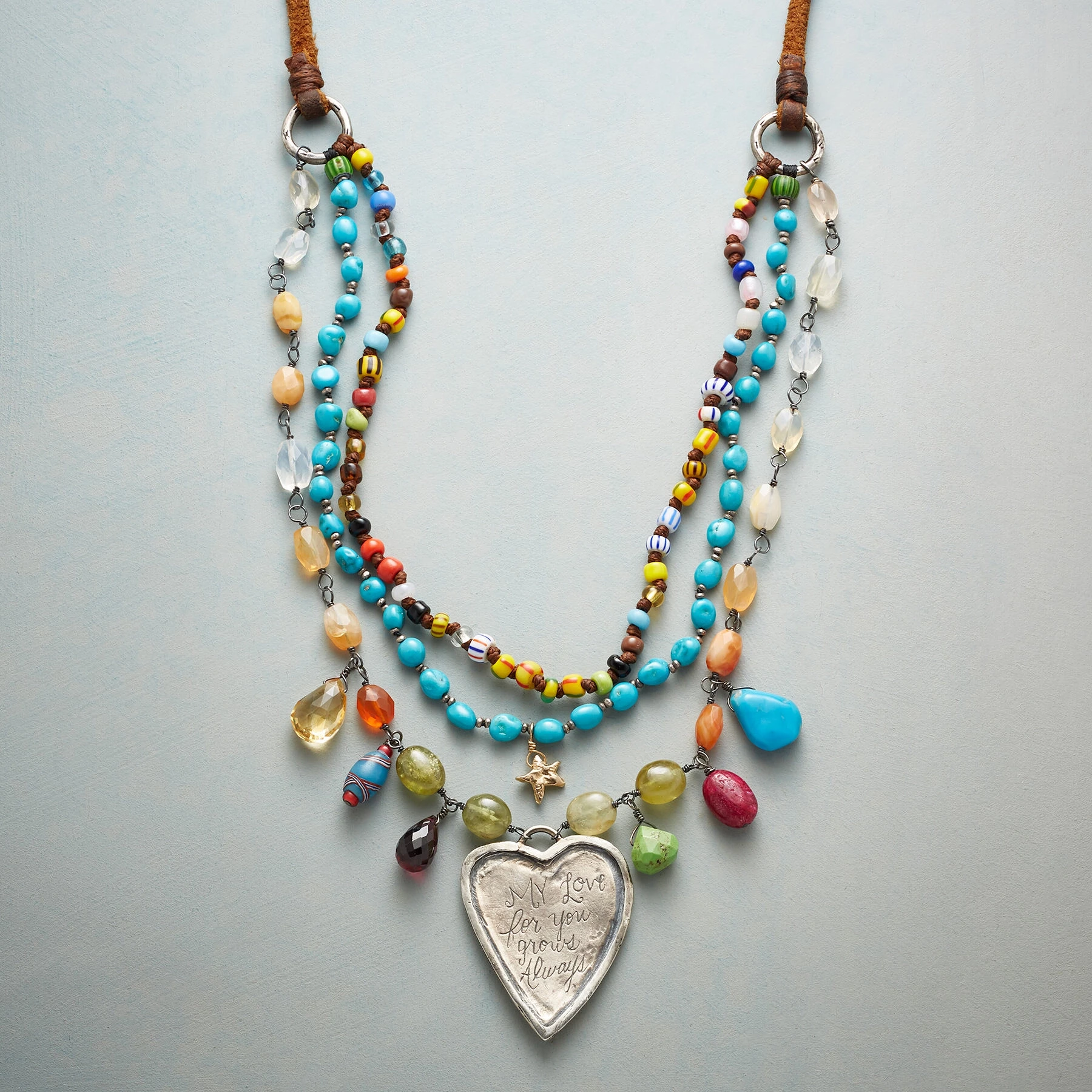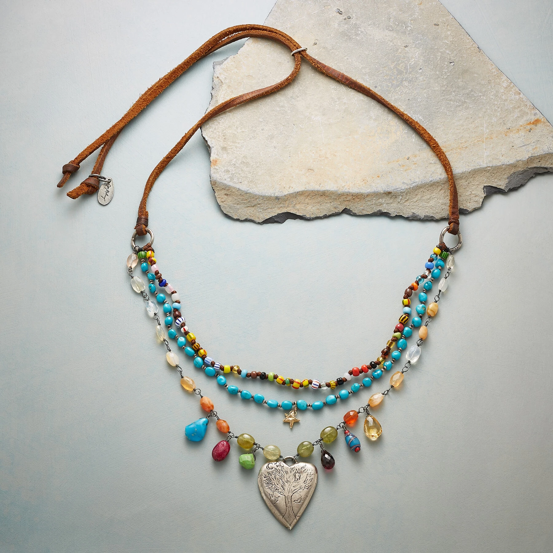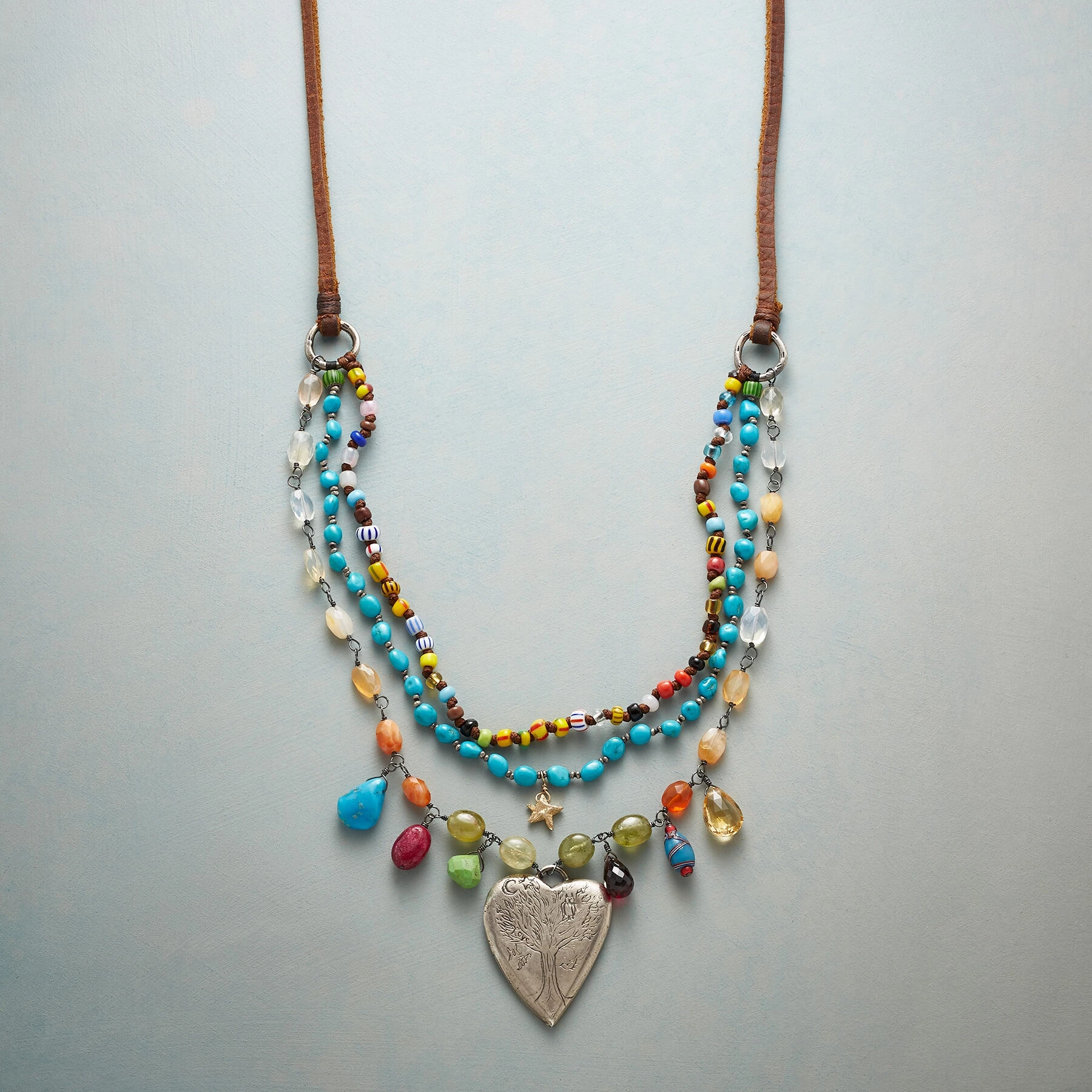 A wise old owl peers out from the tree etched into Jes MaHarry’s sterling silver heart. With turquoise, citrine, trade beads and more. Slider adjusts length to 32″L; 1-3/8″ heart. Exclusive. Handmade in USA.