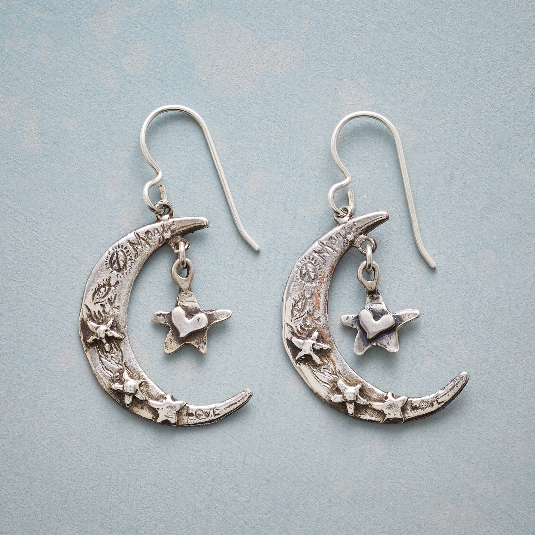 Stars emblazoned with hearts swing and sway from Jes MaHarry’s ‘Heartfelt Moon’ earrings, the crescents engraved with “Follow your heart” on back. Sterling silver; French wires. Exclusive. Handmade in USA. 1-1/2″L.