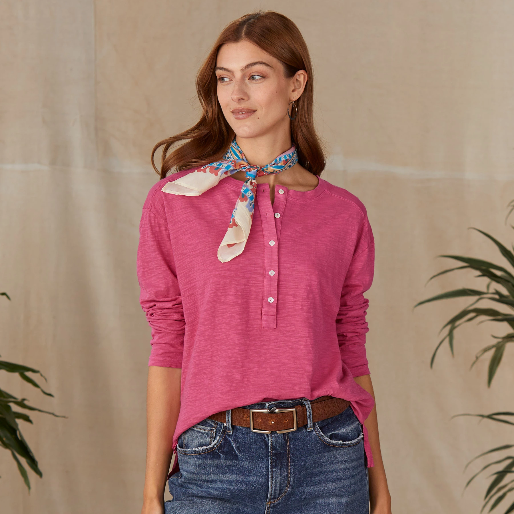 This garment-dyed, cotton slub top offers casual style and a relaxed fit with classic henley placket and side slits. Machine wash. Imported. Sizes XS (0 to 2), S (4 to 6), M (8 to 10), L (12 to 14), XL (16 to 18), XXL (20 to 22). Front approx. 25″L.
