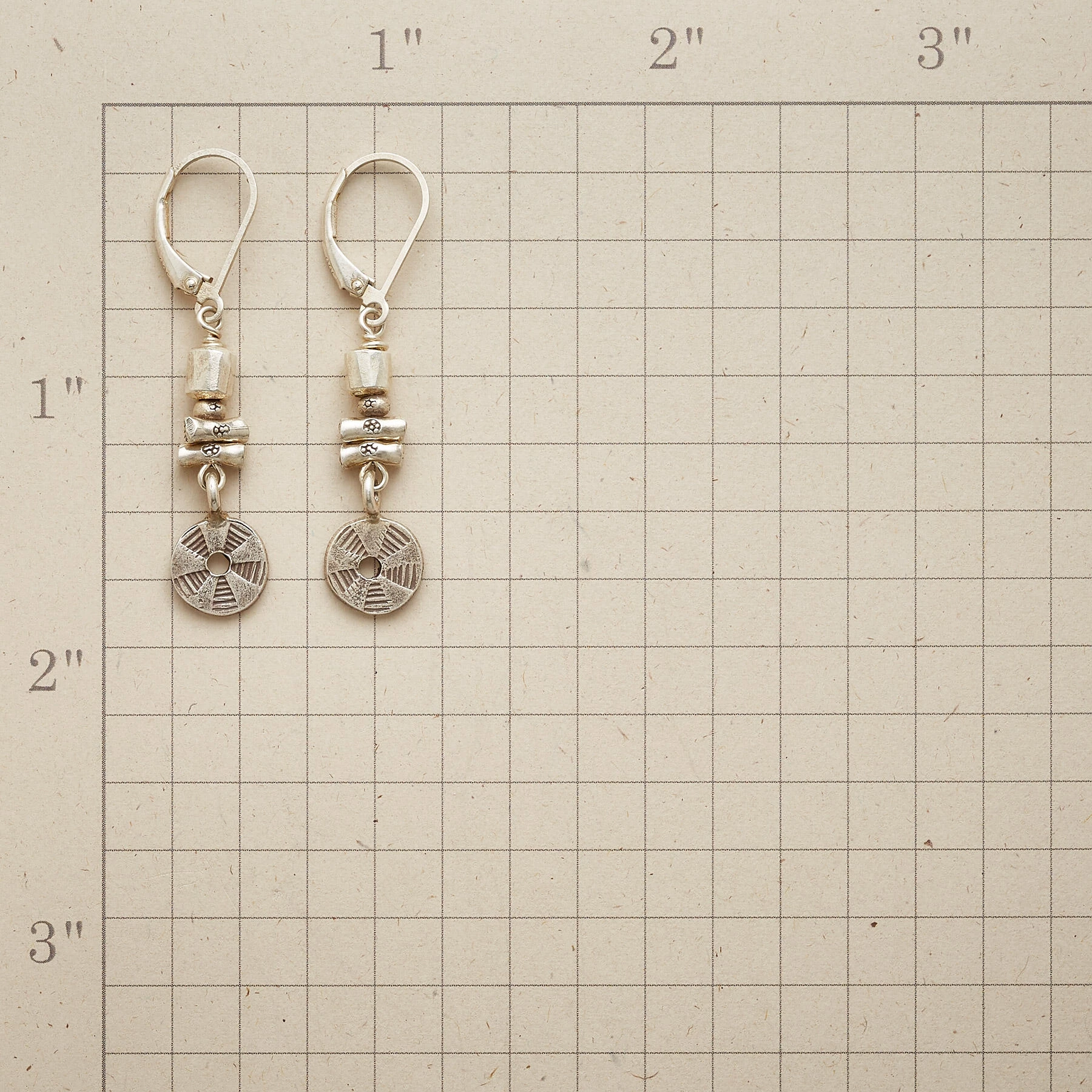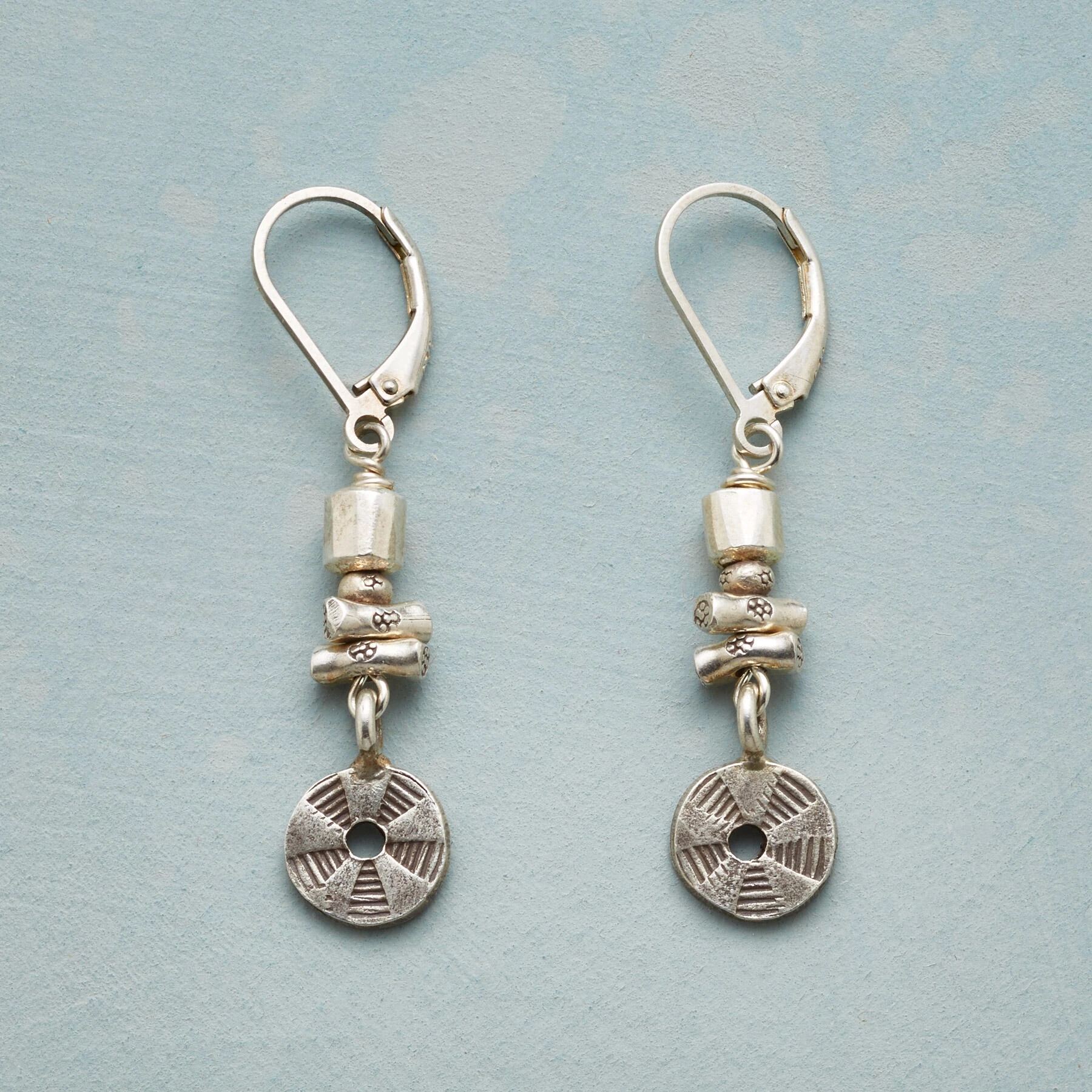 Stamped Thai silver beads ending in a shining pinwheel sway from the ears like wind chimes in the breeze. Sterling silver lever back wires. Handcrafted in USA. Exclusive. 1-3/4″l.