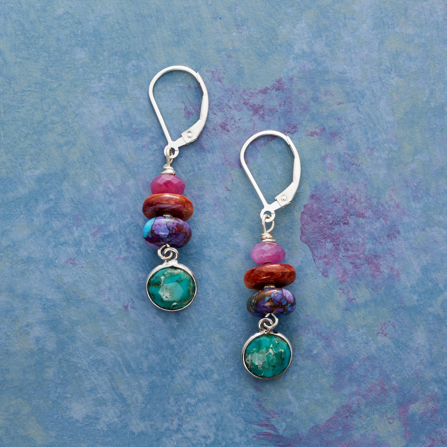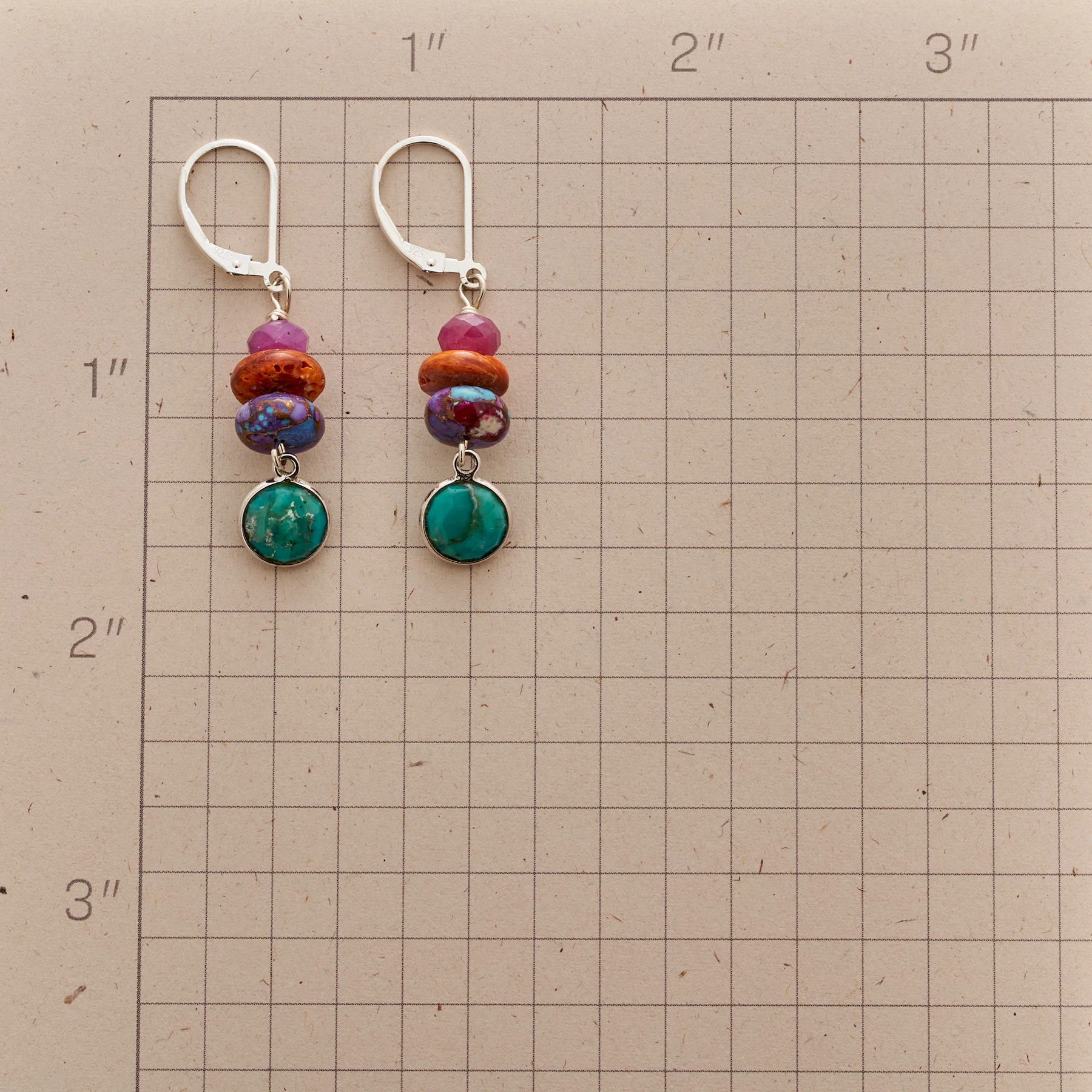 Hints of India join Native American artistry, dual influences reflected in ruby, spiny oyster shell and two turquoise, one tinted purple, the other stabilized. Exclusive. Handcrafted in USA with sterling silver lever back wires. 1-3/4″L.