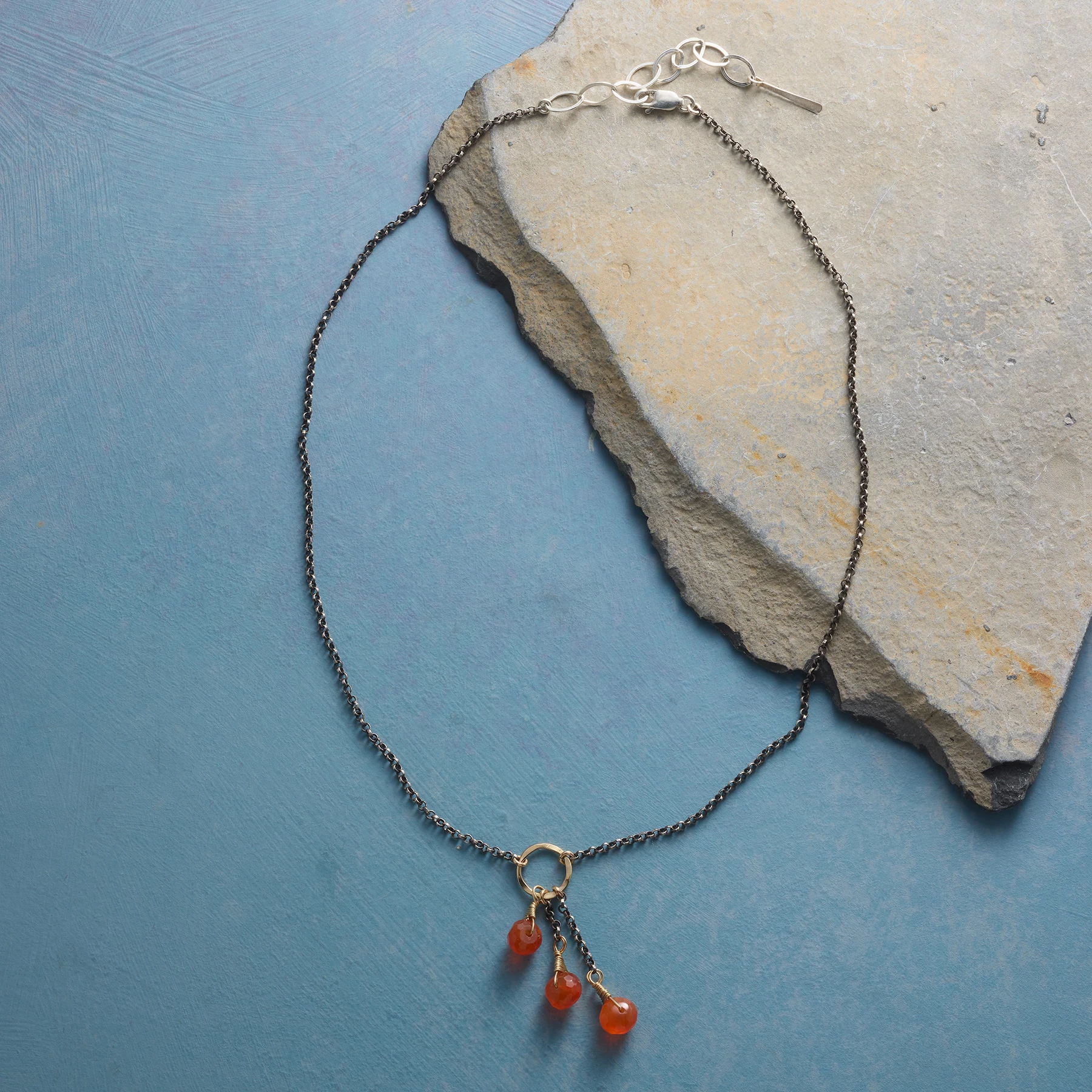 Descending like musical notes from a 14kt gold-filled ring, three carnelians glow against oxidized sterling silver links. Lobster clasp with extender chain. Handcrafted in USA. Exclusive. 17″ to 19-1/2″L.