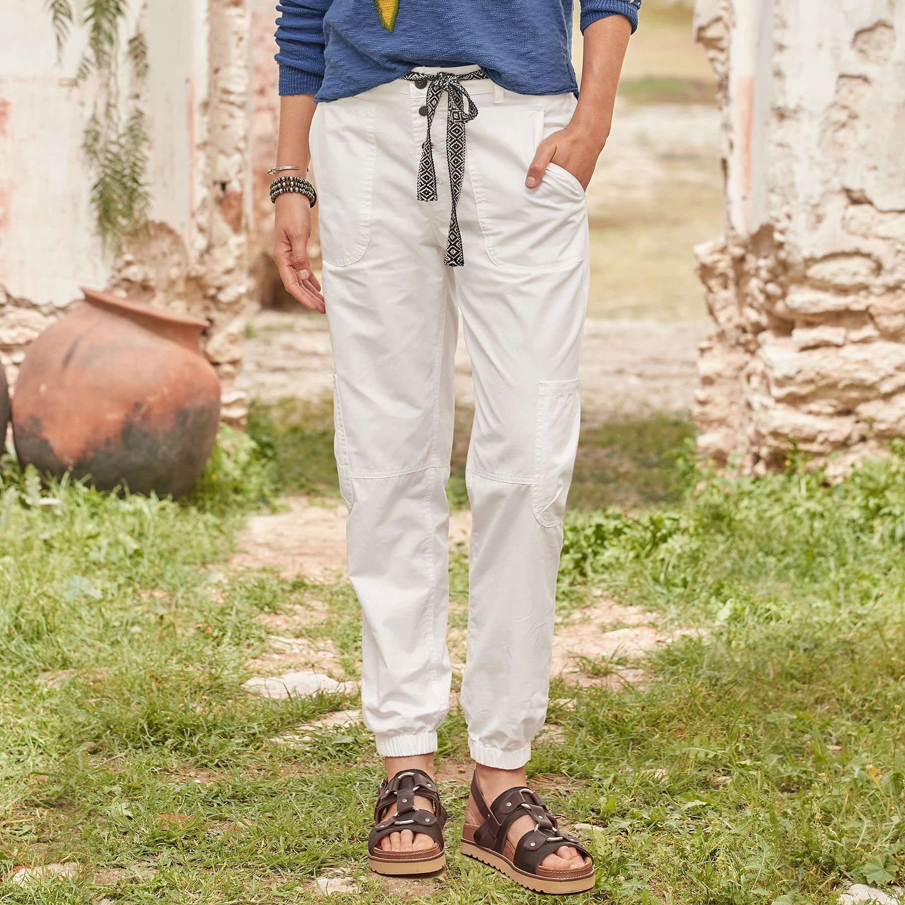 Our comfortable elastic hem joggers featuring woven jacquard belt, exposed button fly, side seam pockets and patch pockets front and back. Cotton. Machine wash. Imported. Exclusive. Sizes 0 to 14. 26″ inseam.
