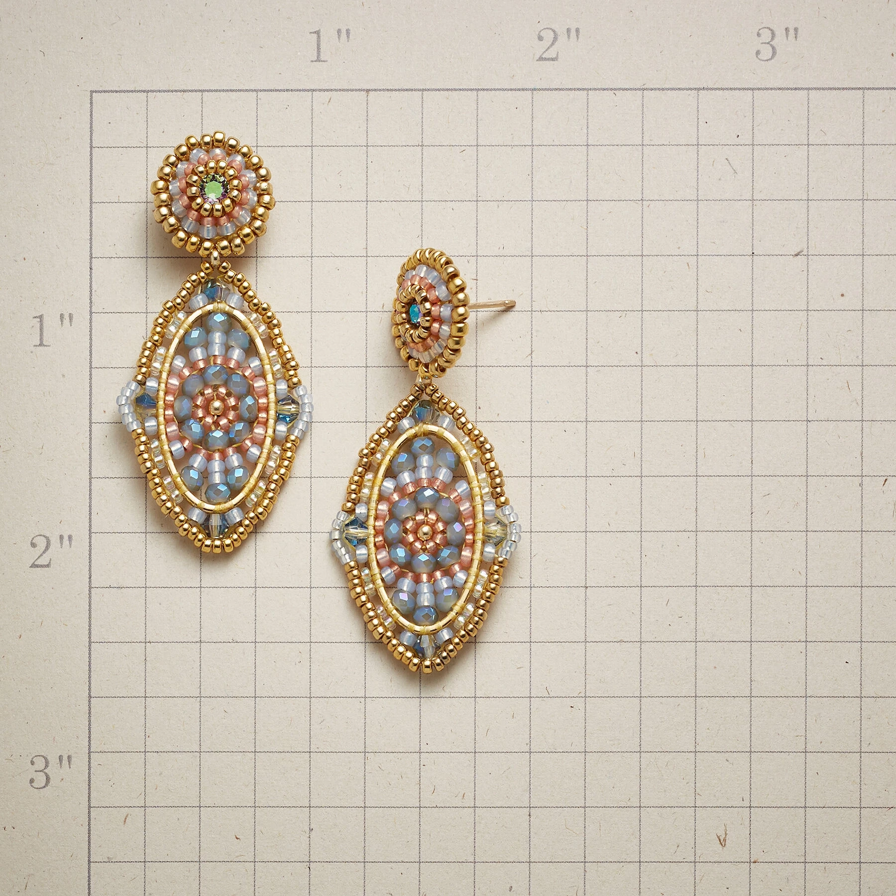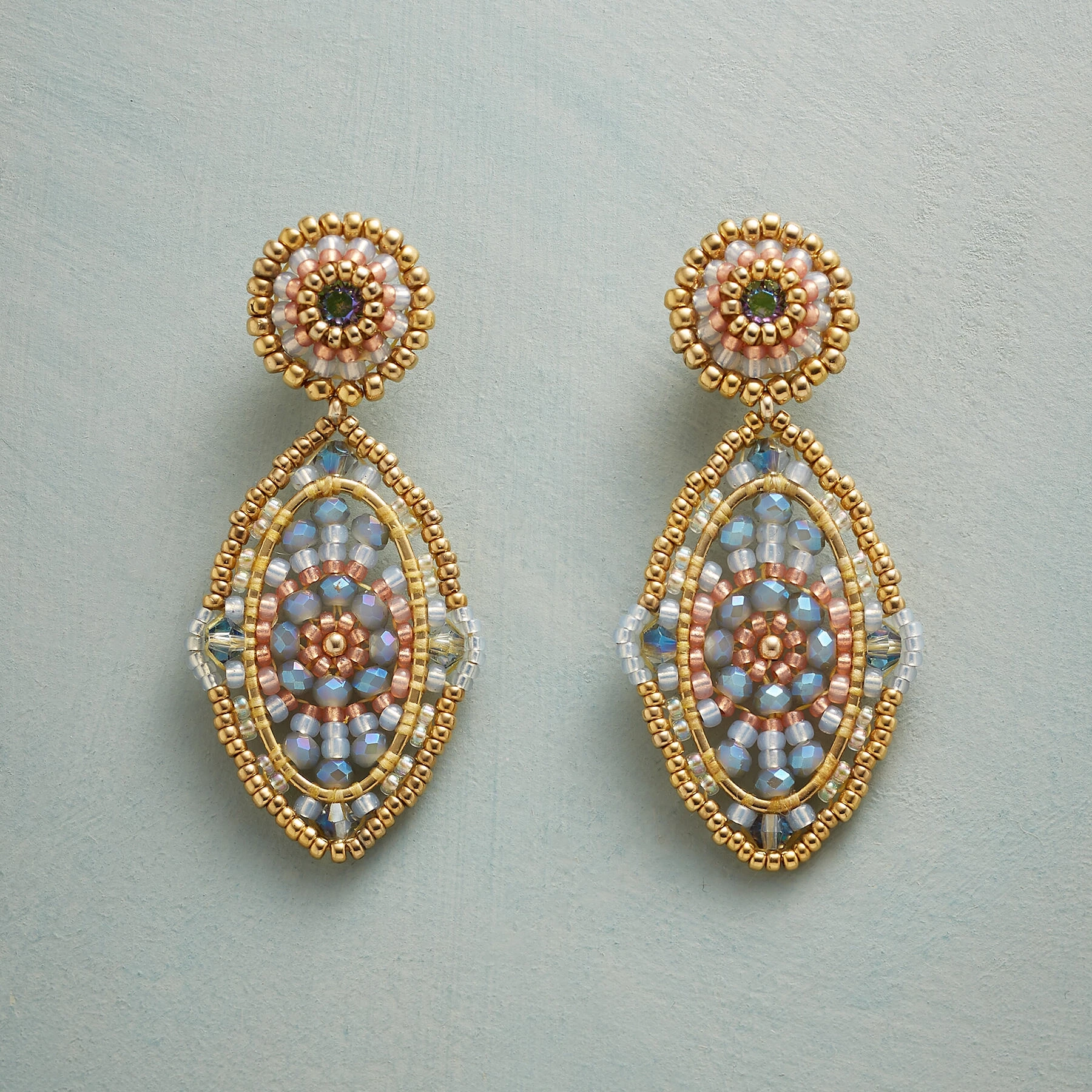 Lacy medallions of crystals and Miyuki glass seed beads are sparked with Swarovski crystals in these ‘Kenmare Lace’ earrings by Miguel Ases. Exclusive. Handmade in USA. 14kt gold-filled posts. 1-7/8″L.