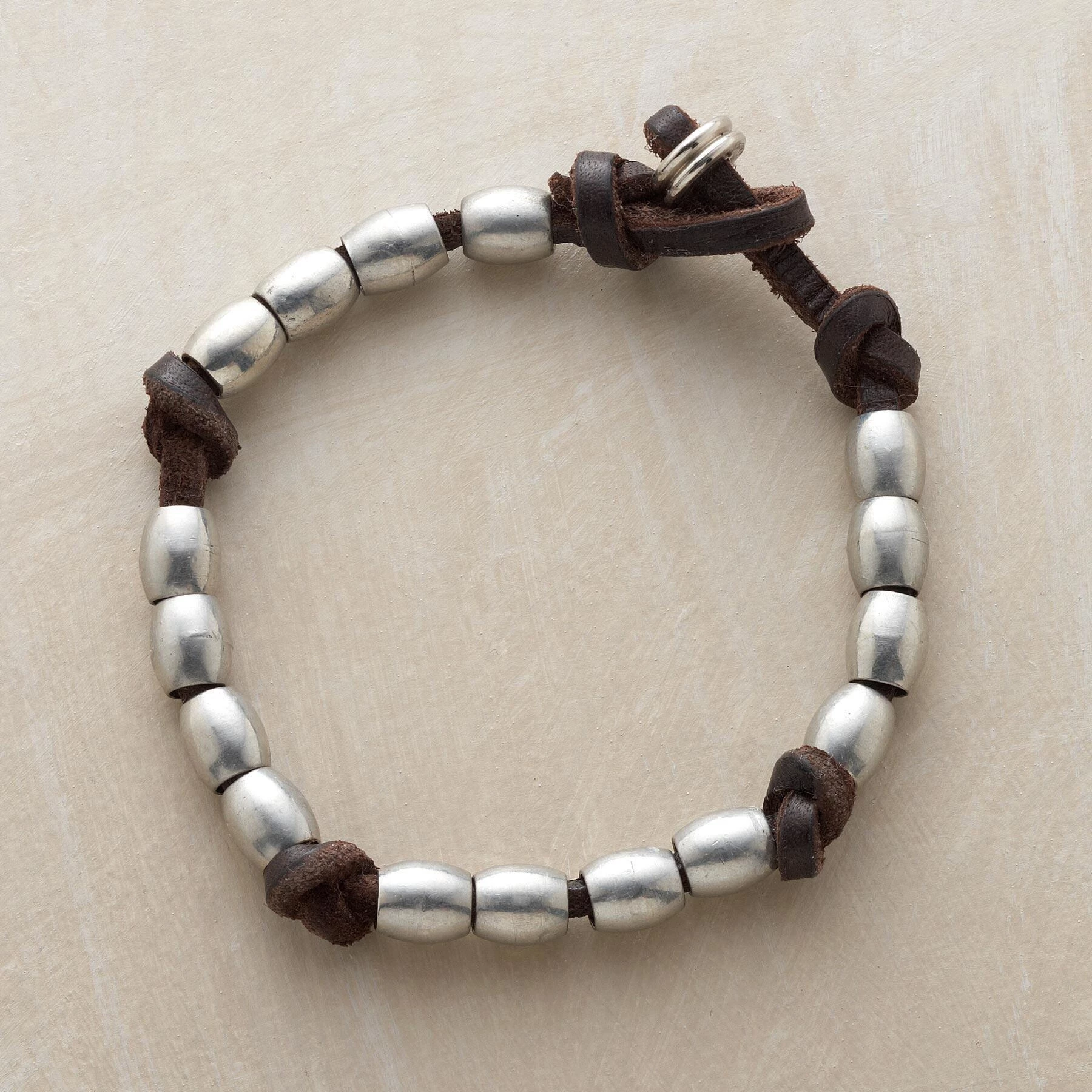 Beads and knots tame dark brown leather cords for the wearing. Threaded with pewter beads. Unmistakably Colonel Littleton, handmade in USA with loop and ring closures. Made in USA. Approx. 9″L.