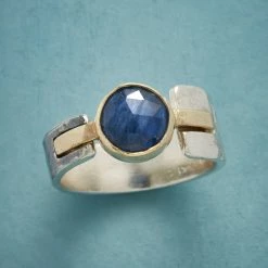 African sapphire floats amid 14kt gold between opposite segments of a sterling silver band, part oxidized, part polished. Exclusive. Hand cast in whole sizes 5-9. Approx. 3/8″ tapers to 3/16″w.