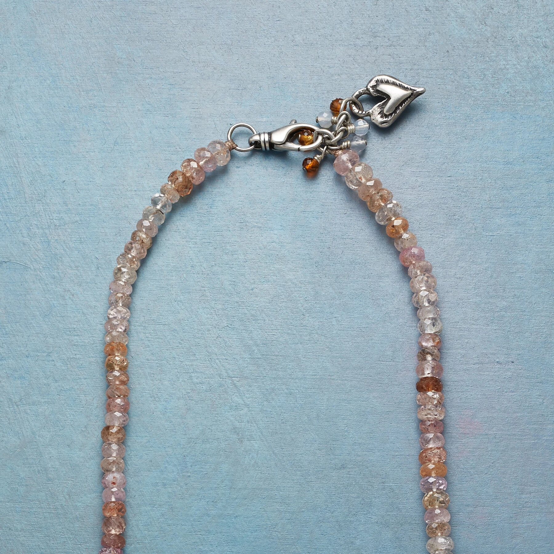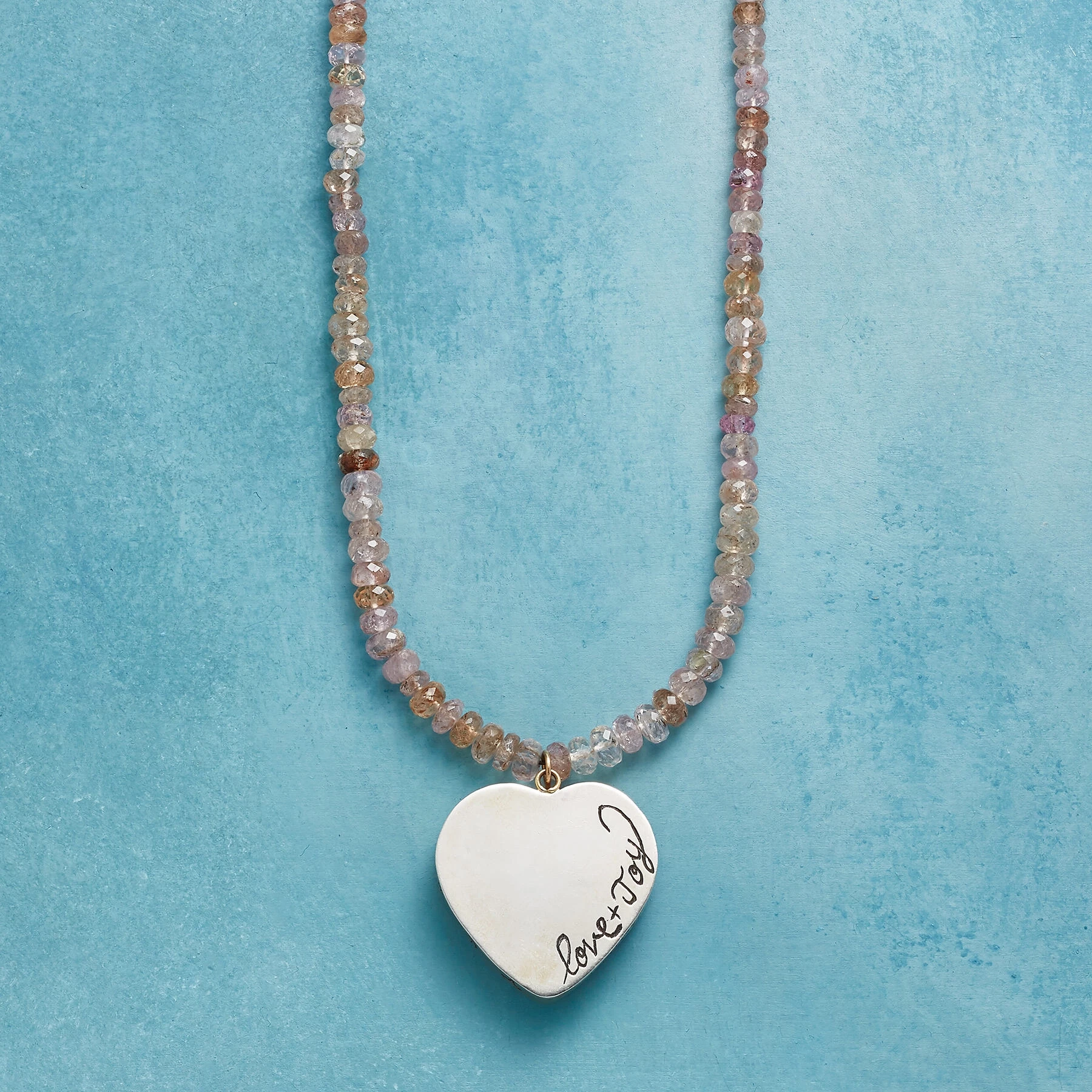 Variegated topaz gems uphold Jes MaHarry’s spiny oyster shell heart, the back engraved, “Love & Joy.” 14kt gold bezel; sterling silver backing and lobster clasp. Exclusive. Handmade in USA. 17″L. Heart 1-1/4″ dia.