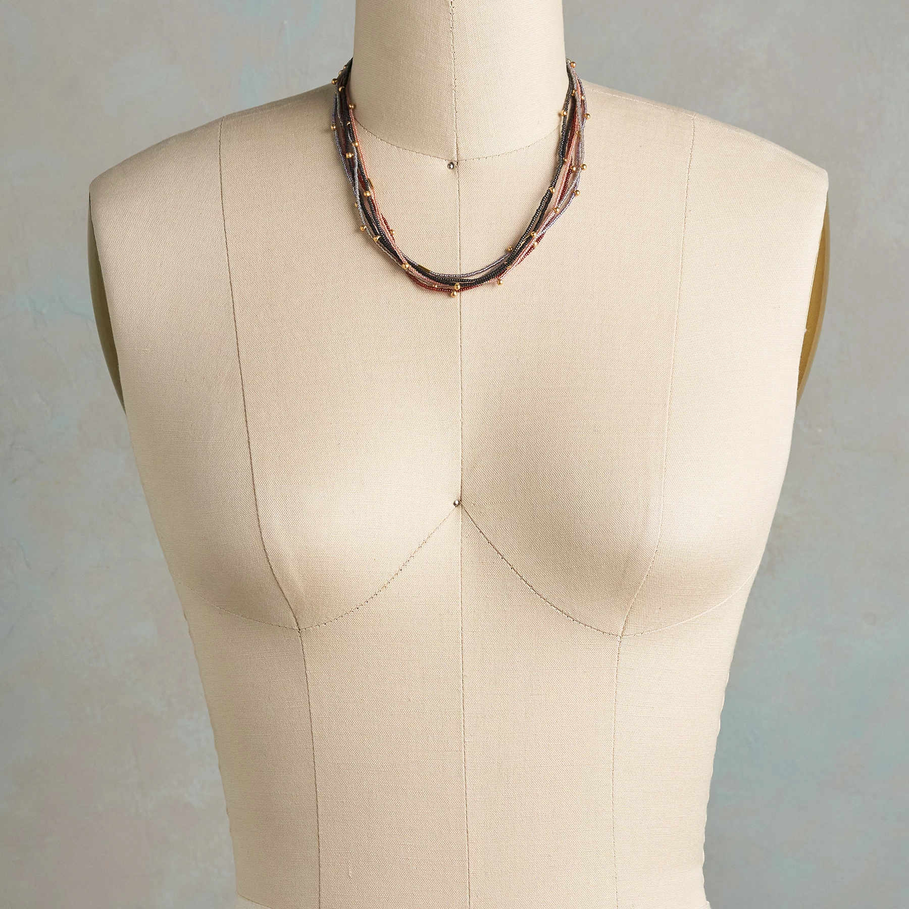 Strands of Japanese glass beads are sparked with 14kt gold-plated beads in a multicolored array of necklaces that stretch to go over the neck. One dangles a gold-plated coin. Handcrafted. Set of 6. 17″L.