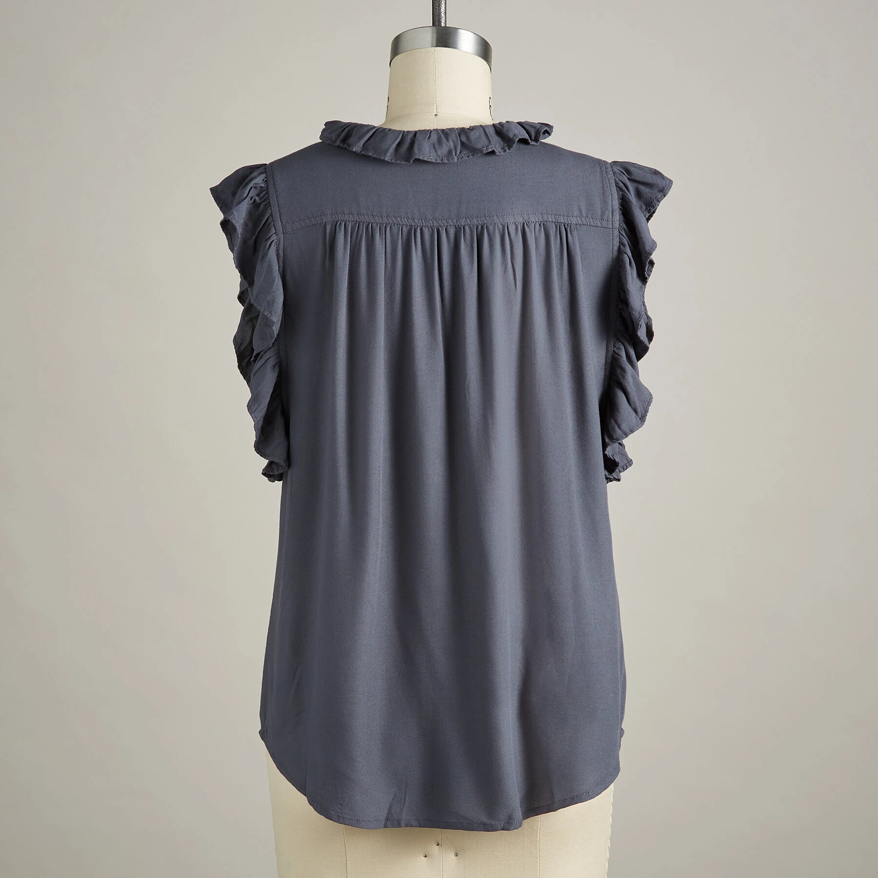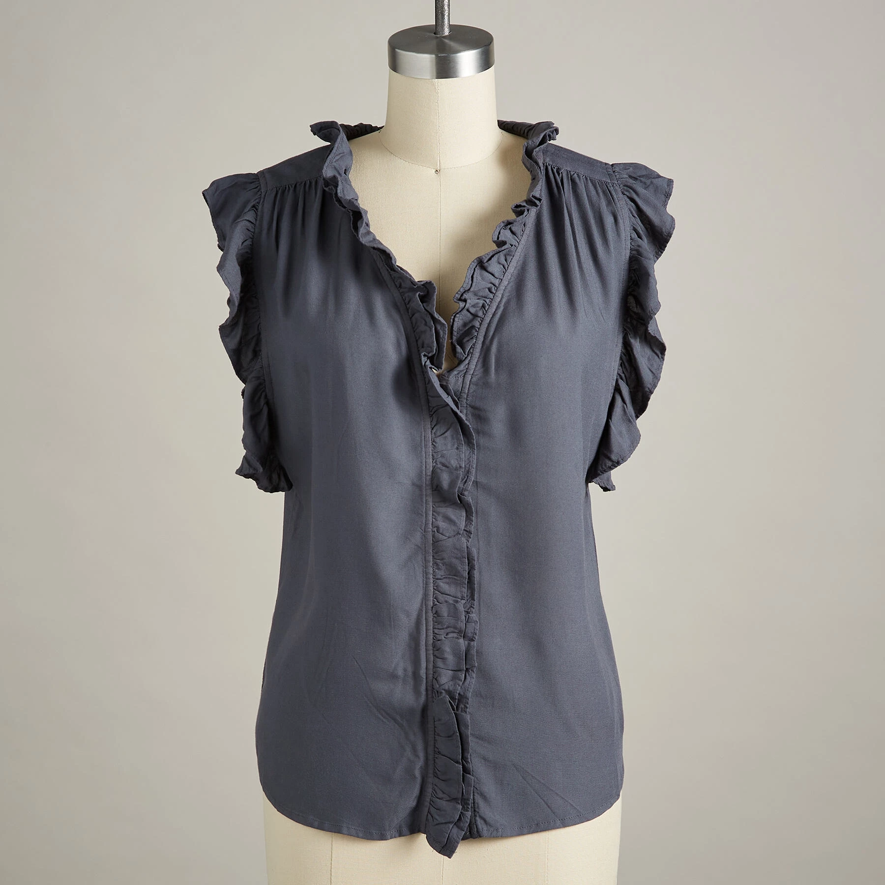 Flowing, easy-fit style with ruffles abounding. Hidden button placket. Rayon. Machine wash. Imported. Sizes XS (4), S (6), M (8 to 10), L (12), XL (14), XXL (16). Approx. 24-2/3″L.
