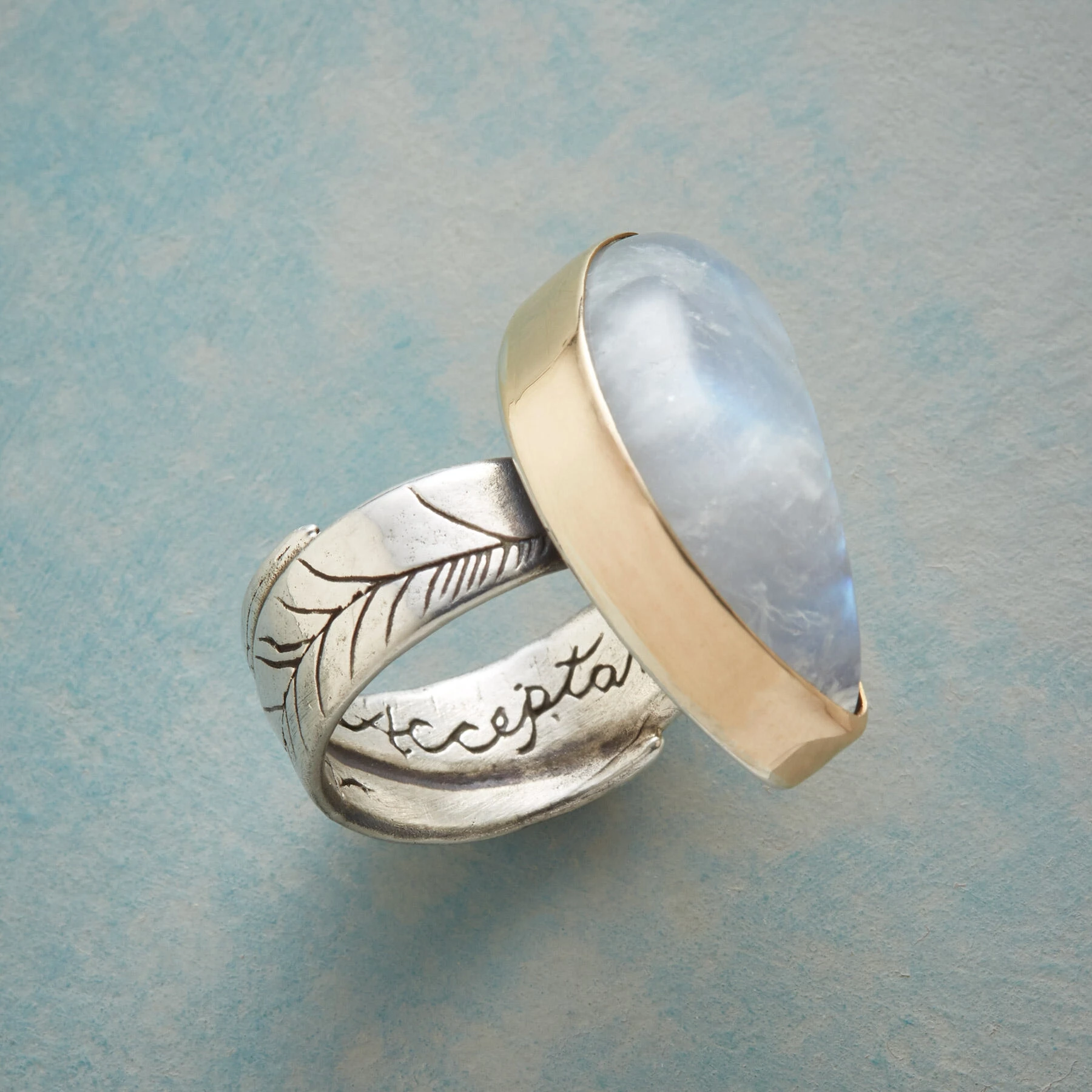 Embraced in a bezel of 14kt yellow gold, free-form rainbow moonstone catches the light. Handcrafted sterling silver band etched with the word “acceptance” inside. By Jes MaHarry. USA. Exclusive. Whole sizes 5 to 9.