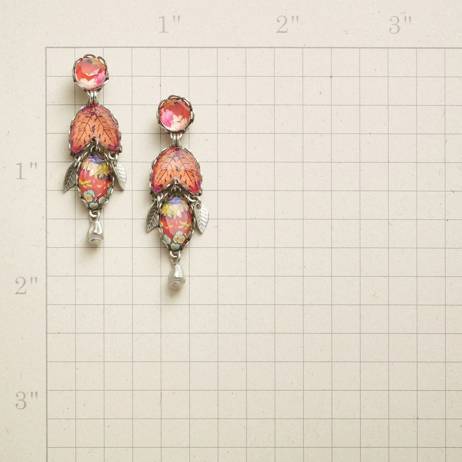 Faceted crystals refract tropical patterns into three tiers of color and light. Silver-plated leaves and raindrops dangle and dance. Posts. Handcrafted. Exclusive. 1-5/8″L.