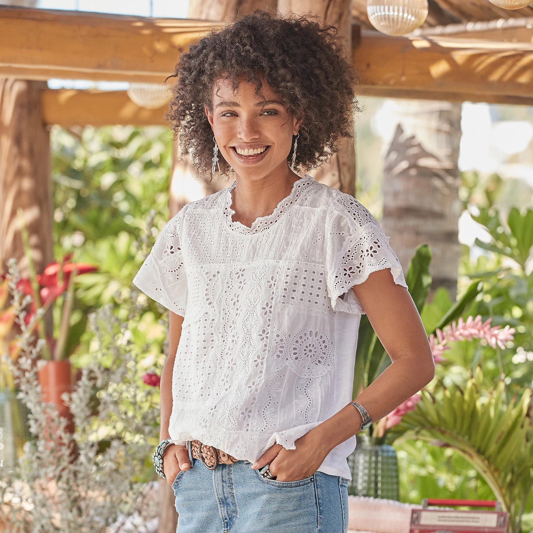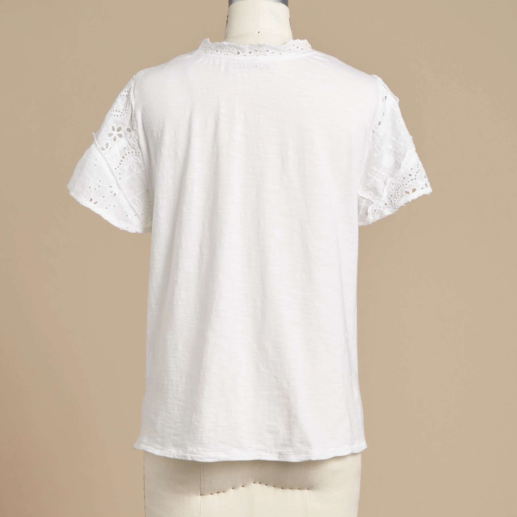 It doesn’t get more romantic than our vintage-inspired, eyelet and lace patchwork top with slight flutter sleeves and scalloped lace at neckline. Mixed media, with woven front and knit back. Cotton. Machine wash. Imported. Exclusive. Sizes XS (0 to 2), S (4 to 6), M (8 to 10), L (12 to 14), XL (16 to 18), XXL (20 to 22). Approx. 24″L.
